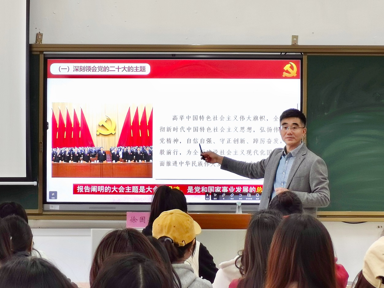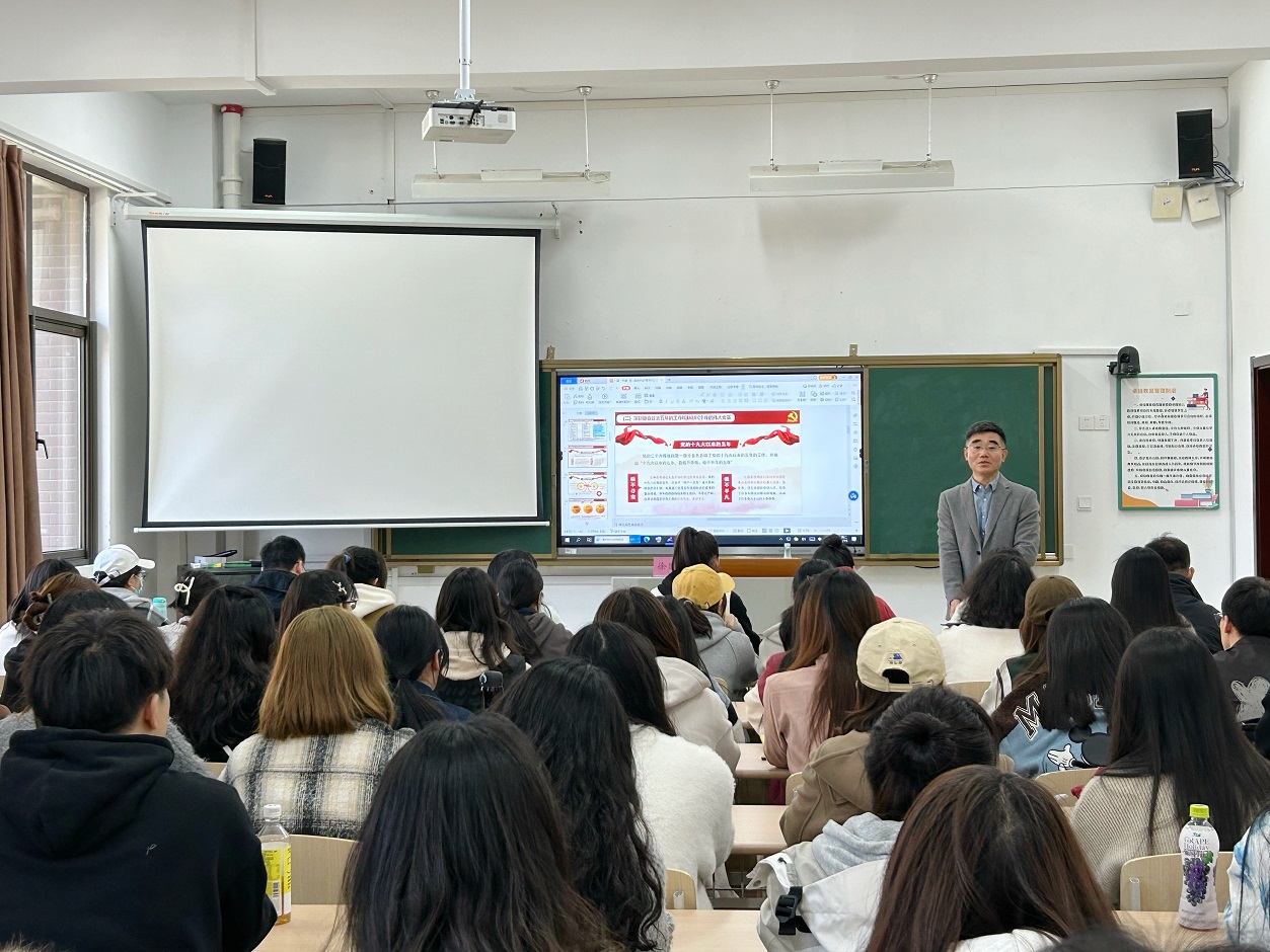 首先,徐校长向同学们描述了党的二十大主要概况。二十大是在全党全国各族人民迈上全面建设社会主义现代化国家新征程、向第二个百年奋斗目标进军的关键时刻召开的一次十分重要的大会。徐校长从旗帜、思想、精神、路径、目标五方面全面解析了大会的主题,我们应高举中国特色社会主义伟大旗帜,全面贯彻习近平新时代中国特色社会主义思想,弘扬伟大建党精神,自信自强,守正创新,踔厉奋发,勇毅前行,为全面建设社会主义现代化国家、全面推进中华民族伟大复兴而团结奋斗。接着,徐校长以习近平总书记参与广西代表团的讨论时提出的“五个牢牢把握”作为导引,向同学们介绍了大会的流程和规范,强调了党的二十大报告的重要意义。党的二十大是全国人民的一次盛会,我们应着重宣传、学习、贯彻党的二十大精神。