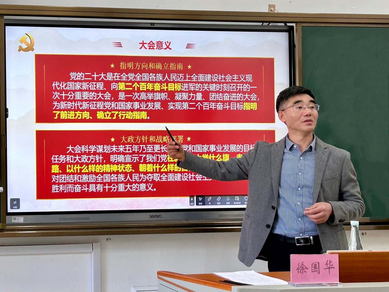 然后,徐校长带领同学们深刻学习过去五年的工作和新时代十年的伟大变革。他说道,我国经历了一段极不寻常、极不平凡的历程,艰辛和成就并存。在如此艰辛的情况取得如此不凡的成就,显得更加来之不易。徐校长还分享了自己的亲身经历,给同学们讲述脱贫攻坚的故事。