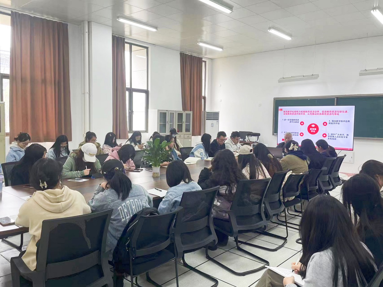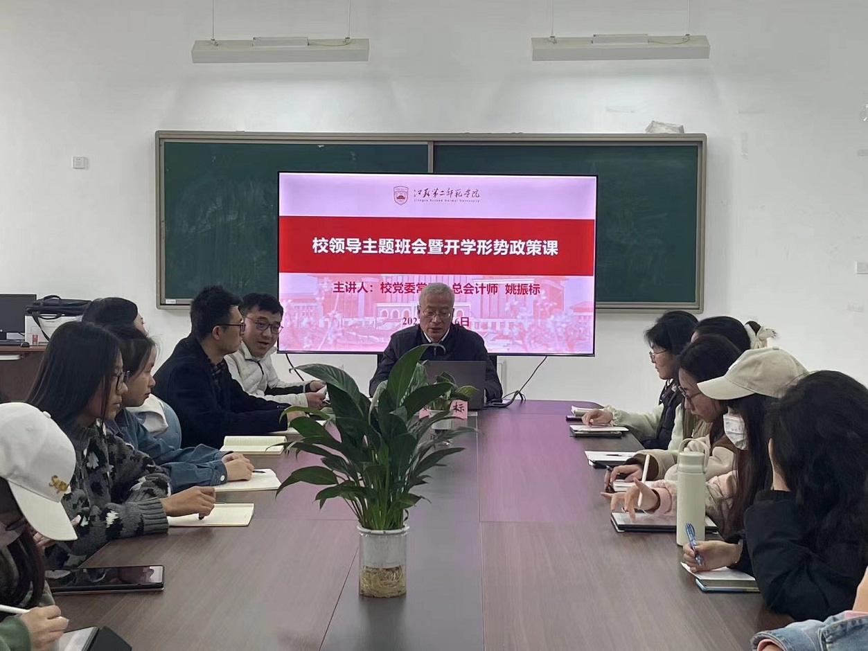 3月16日下午,校党委常委、总会计师姚振标走进外国语学院,在崇文楼1-101会议室讲授形势与政策课并召开主题班会,会议由学院党总支书记余鑫主持,学工办主任王超、辅导员及21级商务英语普本班全体同学参与。