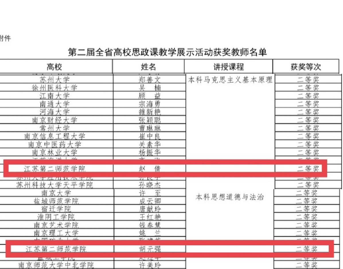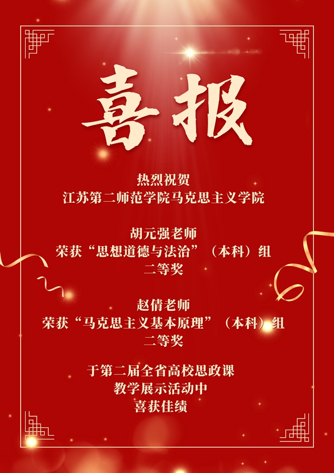 日前,江苏省教育厅公布了第二届全省高校思想政治理论课教学展示活动获奖结果,江苏第二师范学院马克思主义学院胡元强老师荣获“思想道德与法治”(本科)组二等奖,赵倩老师荣获“马克思主义基本原理”(本科)组二等奖。本次教学展示经过学校推荐、省高校思政课教指委各分课程教指委组织初选、省教育厅决赛等环节。比赛中,胡元强老师、赵倩老师以扎实的理论功底、先进的教学理念以及高超的教学艺术,赢得了评委的一致认可,最终从全省众多优秀的思政课教师中脱颖而出,喜获佳绩。