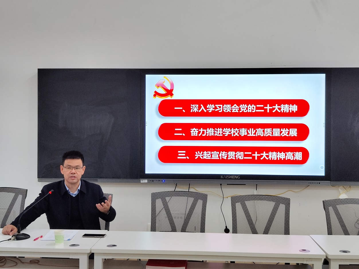 在第一阶段中,刘贵友分三个部分进行讲授。一是深入学习党的二十大精神,从一个“主题”、三大“成果”和五个“新”来系统把握二十大精神的精髓主旨;二是深刻理解建设教育强国战略,要牢牢把握过去5年的工作和新时代10年的伟大变革对于加快建设教育强国的重大政治意义;三是准确把握高等教育发展形势,他判断分析了我国高等教育发展阶段和方位的三个角度以及列举了我国应对高等教育发展走向的几点举措,最后结合学校自身,强调要奋力推进学校事业高质量发展。