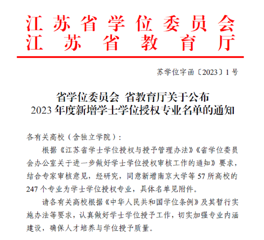 日前,江苏省学位委员会、省教育厅发布《省学位委员会省教育厅关于公布 2023年度新增学士学位授权专业名单的通知》(苏学位字函〔2023〕1 号),我校科学教育、汉语国际教育和食品科学与工程三个专业顺利通过学士学位授权专业审核,获得学士学位授予权。