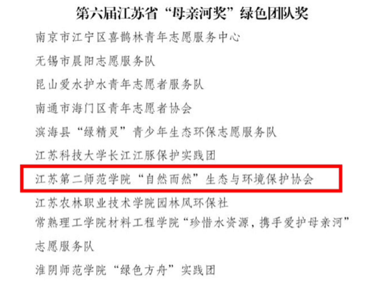 近日,第六届江苏省“母亲河奖”评选结果公布,我校生化学院“自然而然”生态与环境保护协会因推动绿色环保、开展志愿服务方面贡献突出,被授予“绿色团队奖”,成为全省获此殊荣的十个团队之一。