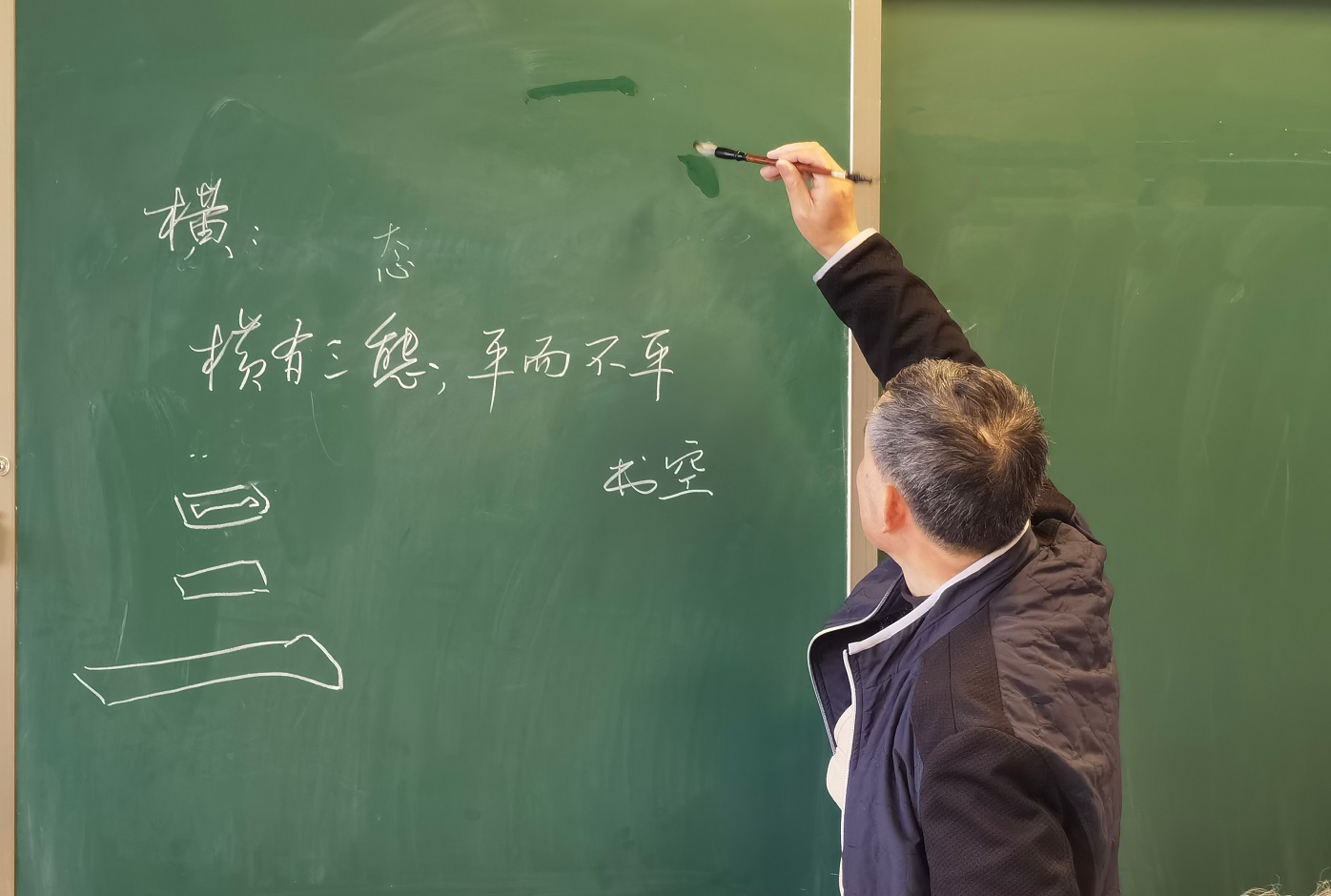 开班启动仪式结束后,进行了书法班第一讲授课。胡相峰教授介绍了中国书法发展简史,分析了基础笔画的起势,讲授了执笔姿势,并对如何选贴,如何购买笔、墨、纸等书法学习必用品作了介绍。随后带领学员通过基础笔画的练习寻找书写的感觉。