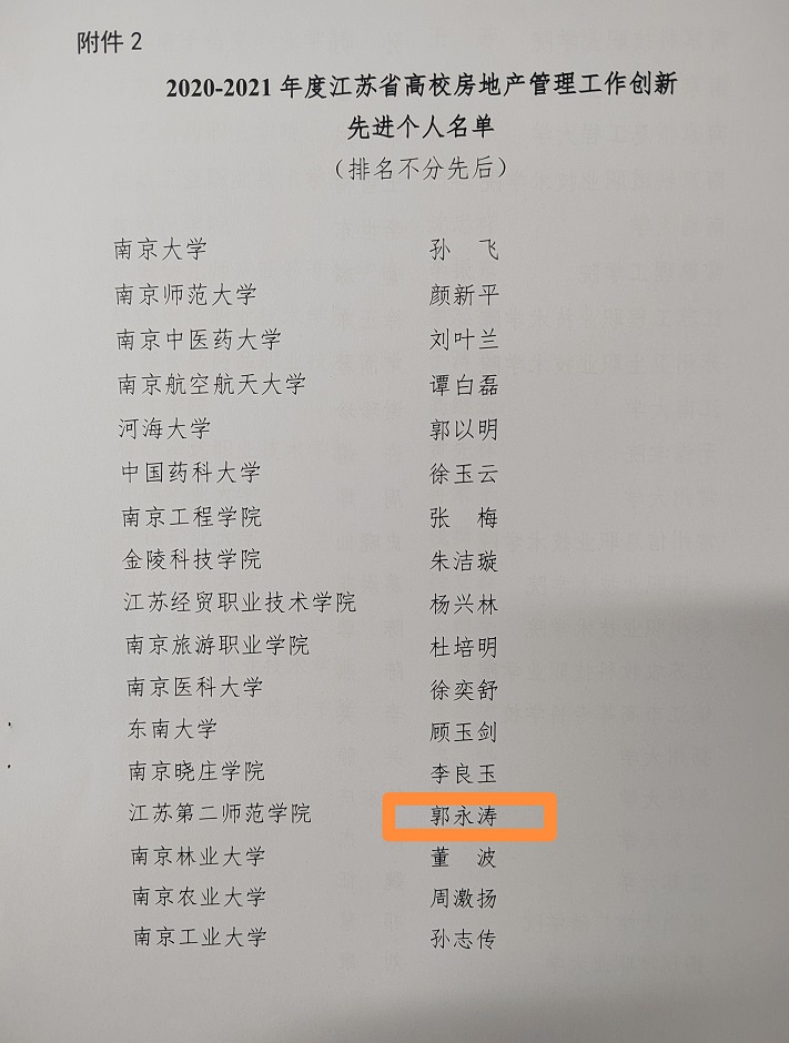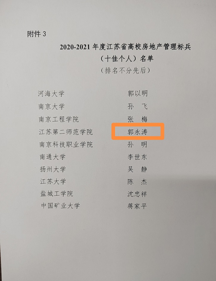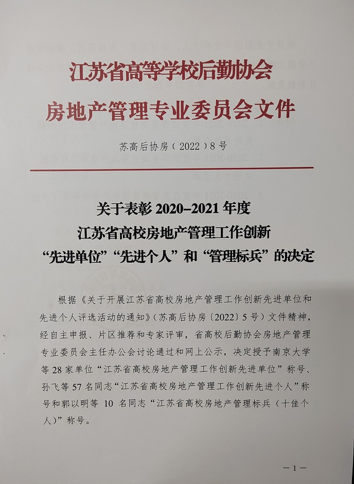 4月6日至8日,江苏省高等学校后勤协会房地产管理专业委员会2022年年会在徐州市隆重举行,来自全省63所高校173名代表参加了本次年会。我校被评为2020-2021年度江苏省高校房地产管理工作创新先进单位,后勤与基建处郭永涛同志获得2020-2021年度江苏省高校房地产管理工作创新先进个人和管理标兵(十佳个人)荣誉称号。