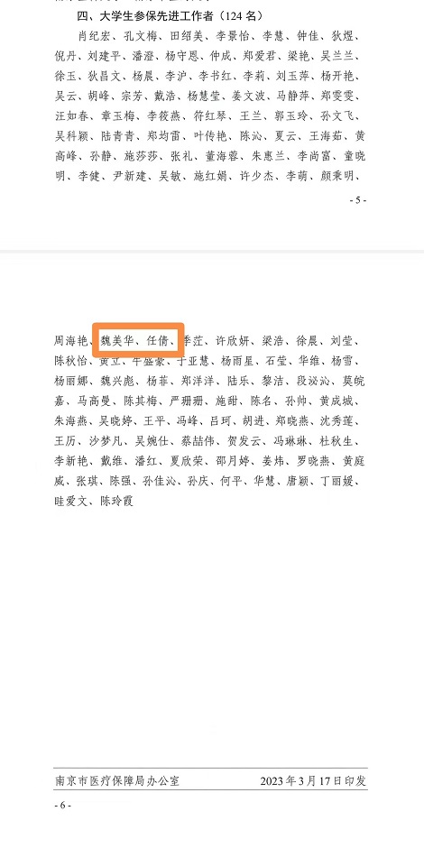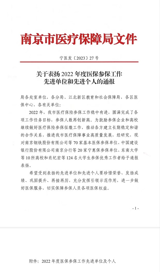 近日,2022年南京市医疗保险参保工作顺利结束,我校各项工作任务目标圆满完成,后勤与基建处魏美华、任倩同志荣获南京市医疗保障局2022年度大学生医保参保先进工作者荣誉称号。