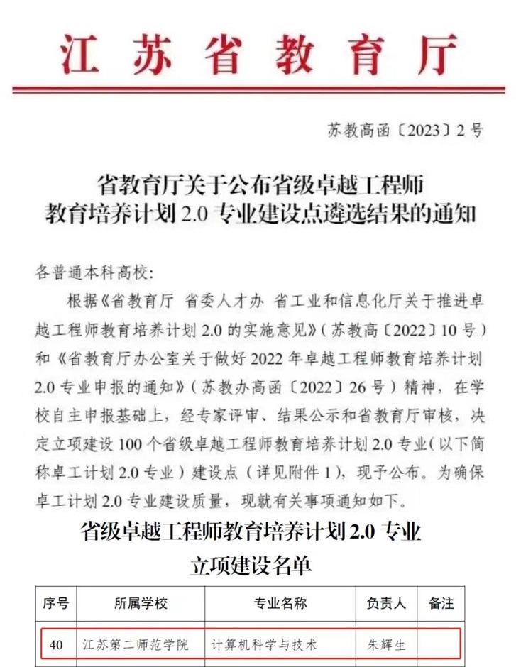 近日,江苏省教育厅下发《关于公布省级卓越工程师教育培养计划2.0专业建设点遴选结果的通知》(苏教高函〔2023〕2号),我校计算机科学与技术专业获批立项建设。