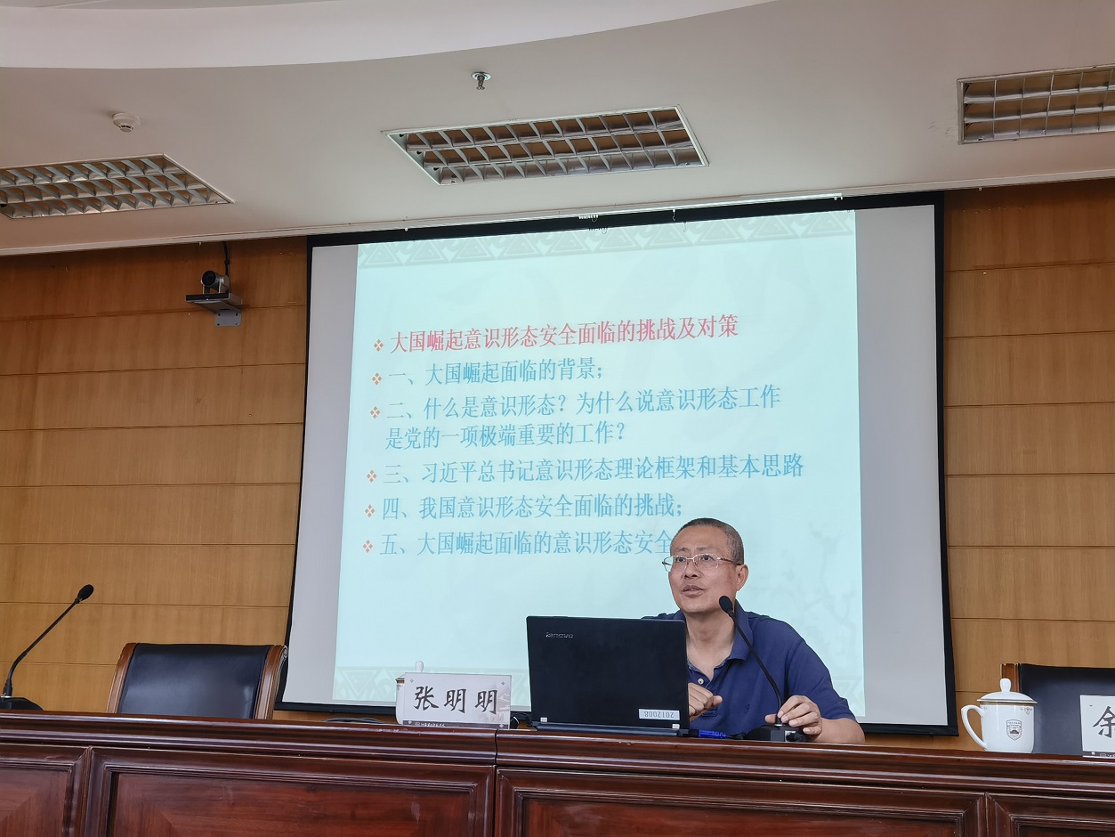 随后,张明明主任紧紧围绕“大国崛起意识形态安全面临的挑战及对策”为主题,介绍了目前意识形态工作面临的新的时代背景,阐明了意识形态工作必须厘清的九个问题,并就中国崛起意识形态安全面临的挑战进行了详细的对策分析。生动详实的案例、通俗易懂的语言让全体参会人员对意识形态工作的重要性有了更深的认识和新的理解。