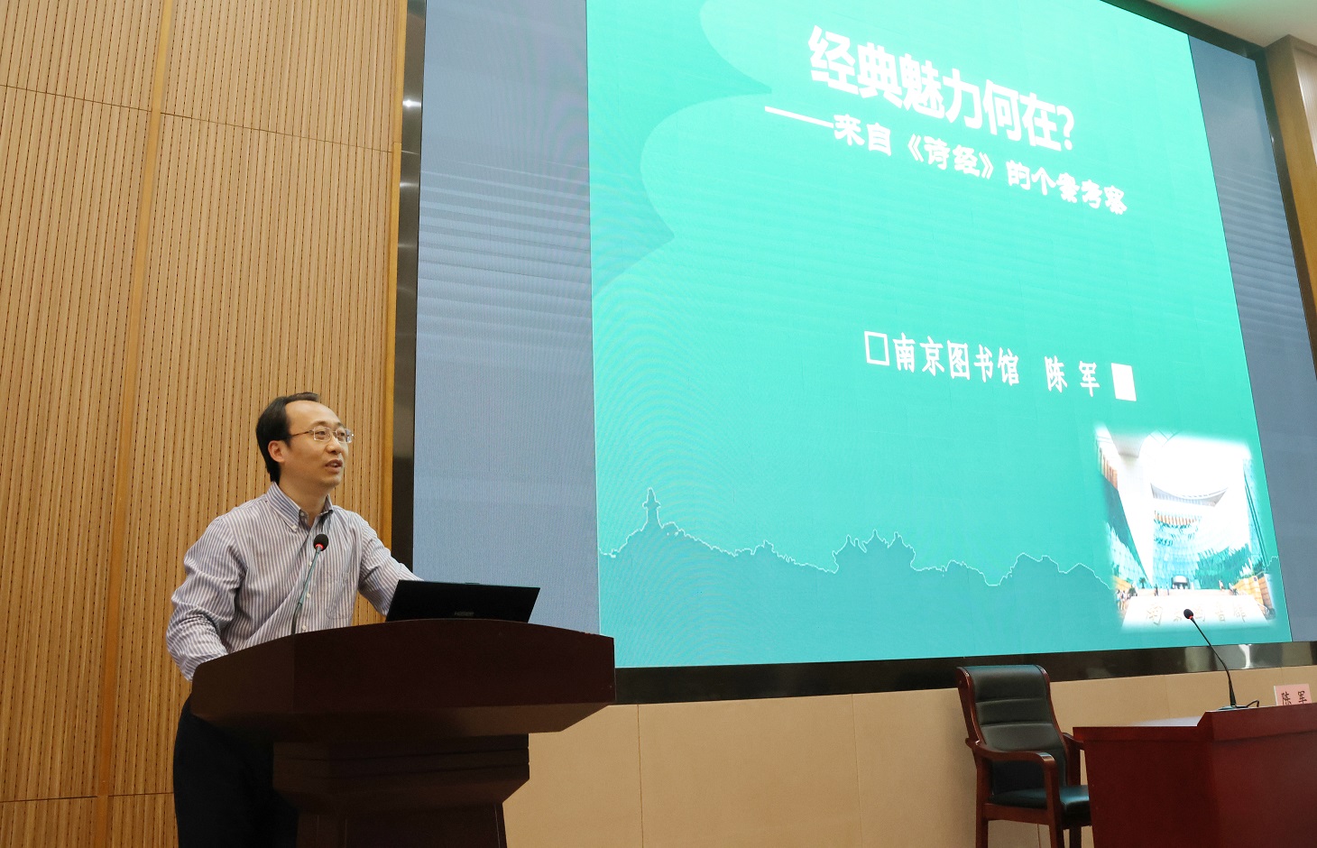 开幕式后,南京图书馆馆长陈军教授为师生做题为《文化经典“诗经”之魅力》的文化讲座。