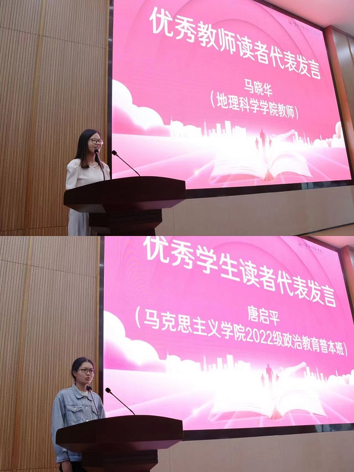 首先,教务处处长陈蓓宣读了《关于表彰2022年度“优秀读者”的决定》,相关职能部门负责人为受表彰个人颁发荣誉证书。优秀教师读者代表、地理科学学院教师马晓华分享了自己对读书的感悟,鼓励同学们利用读书节契机,读好书,共成长。“悦读之星”代表、马克思主义学院学生唐启平呼吁同学们要充分利用图书馆丰富的馆藏资源,珍惜时光去阅读,收获快乐和知识。