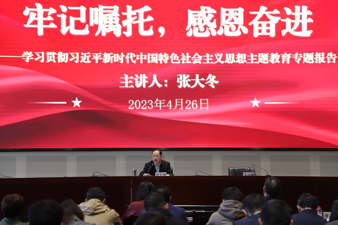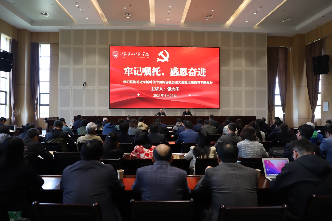 4月26日下午,我校举行学习贯彻习近平新时代中国特色社会主义思想主题教育首场专题报告会,邀请第十四届全国人大代表、第十四届江苏省党代表、淮安市新安小学校长、新安旅行团历史陈列馆馆长、江苏省特级教师张大冬作专题报告。校党委领导班子成员、校领导和全体中层干部参加报告会。报告会由党委书记、校主题教育领导小组组长王仁雷主持。