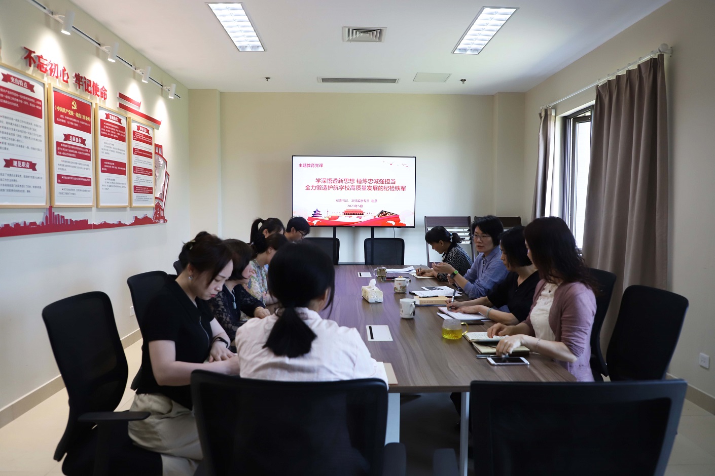 崔燕强调,在主题教育和纪检监察干部队伍教育整顿中,我们要紧紧围绕党中央部署要求,以“再出发”的姿态,深刻把握全面从严治党永远在路上、党的自我革命永远在路上的重大判断,稳中求进、守正创新,不断提高学校纪检监察工作水平,锻造高素质纪检监察“铁军”,以全面从严治党新成效引领和保障学校高质量发展。
