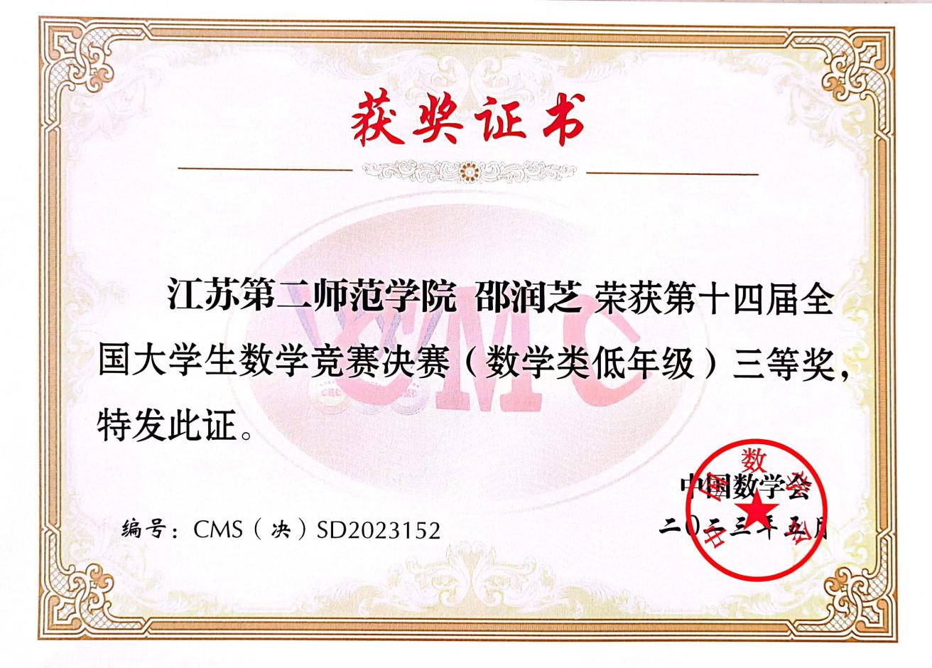 5月26-28日,第十四届全国大学生数学竞赛决赛在广东工业大学成功举行。数学科学学院2021级数学与应用数学专业邵润芝同学获得数学类低年级组三等奖。