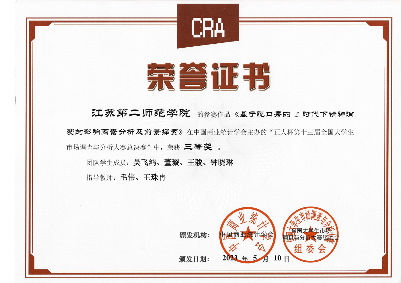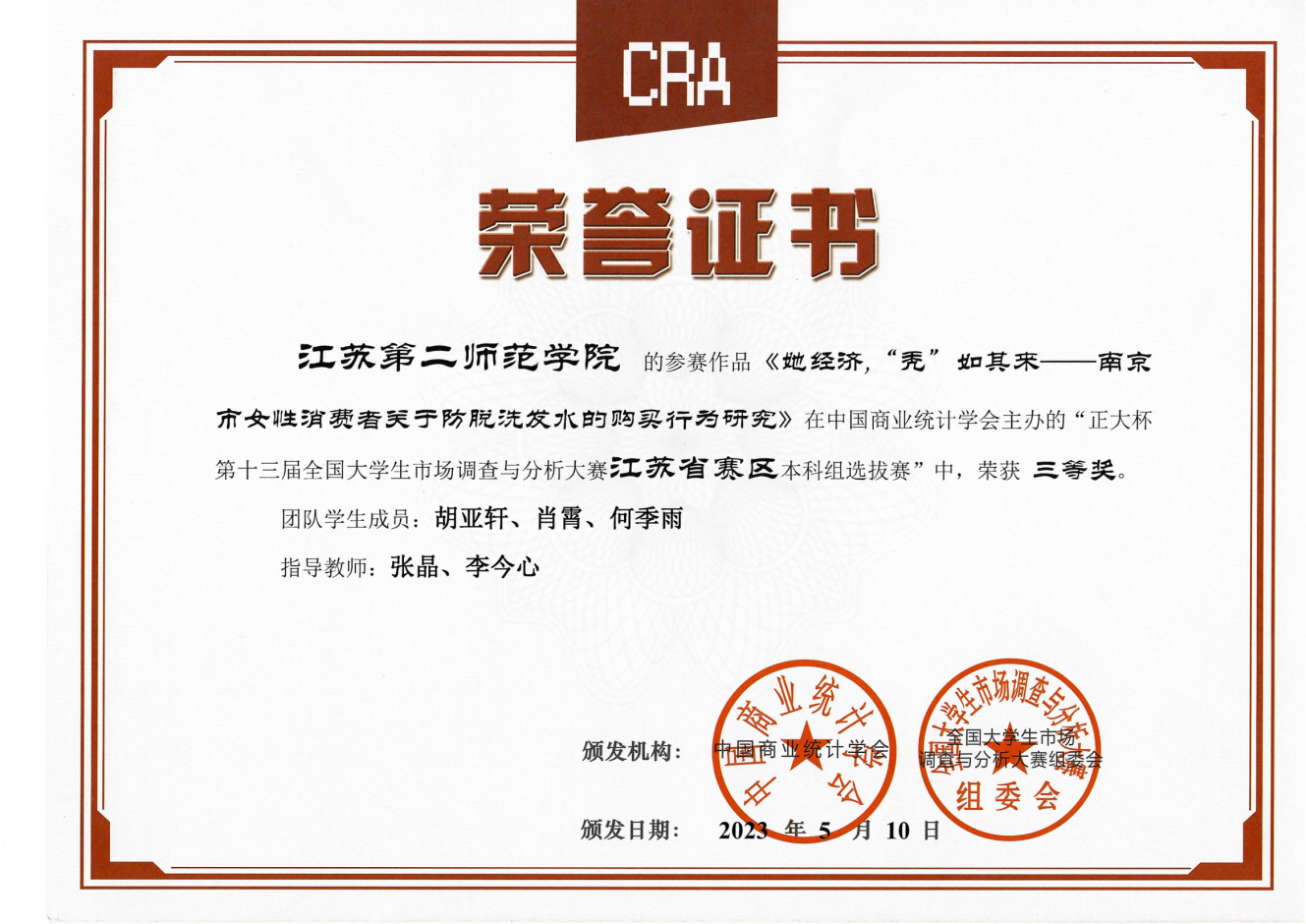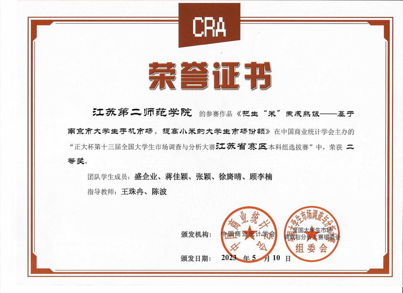 5月中旬,在第十三届全国大学生市场调查与分析大赛(江苏省赛区)中,数学科学学院学生提交的参赛作品《把生“米煮成熟饭——基于南京市大学生手机市场,提高小米的大学生市场份额”》获得二等奖,《基于脱口秀的Z时代下精神消费的影响因素分析及前景探索》及《她经济,“秃”如其来——南京市女性消费者关于防脱洗发水的购买行为研究》分别获得三等奖。