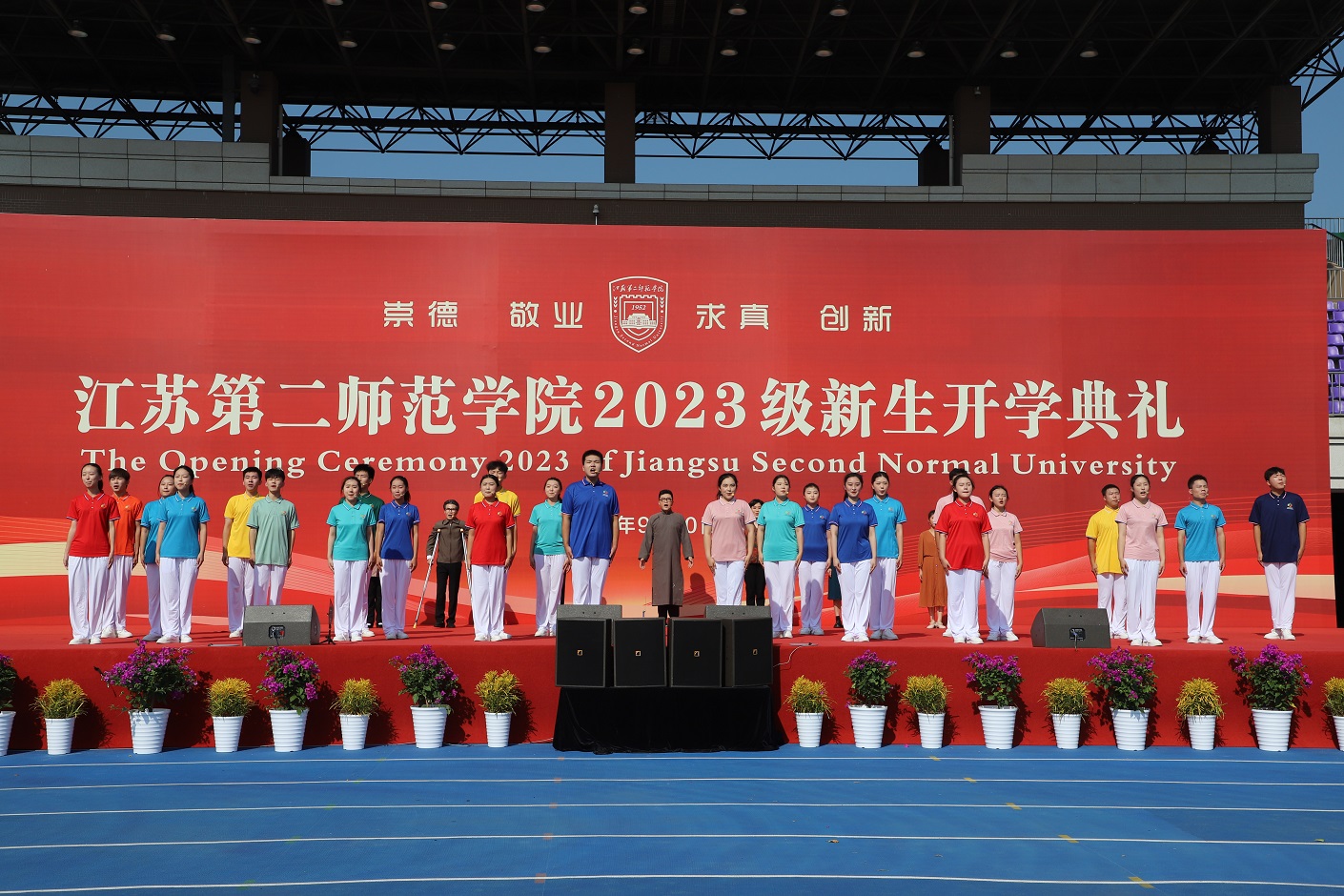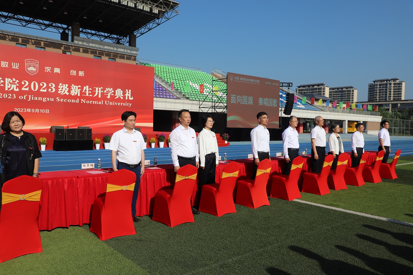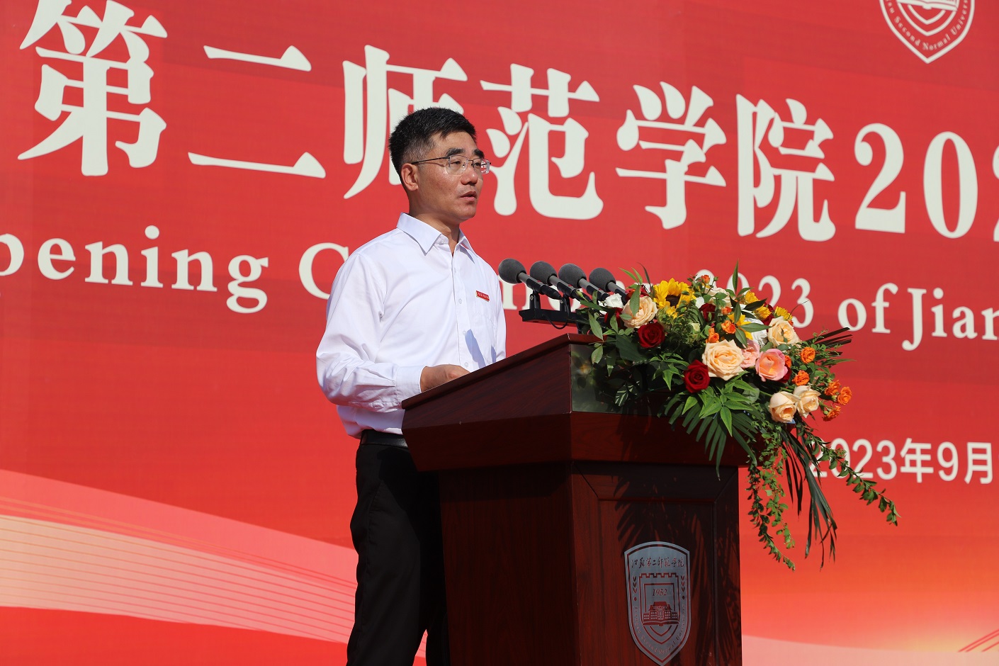 9月10日,我校2023级新生开学典礼在石湫校区举行。校党委书记王鲁沛、校长徐国华,校领导刘继红、崔燕、姚振标、皇甫立同、赵玉蓉、梅景辉、花书贵,各职能部门、二级学院负责人,教师代表、学生代表、家长代表,以及全校4000多名2023级新生,共聚一堂,学习习近平总书记重要指示精神,大力弘扬教育家精神,开启“躬耕教坛、强国有我”新篇章。典礼由党委副书记、副校长刘继红主持。