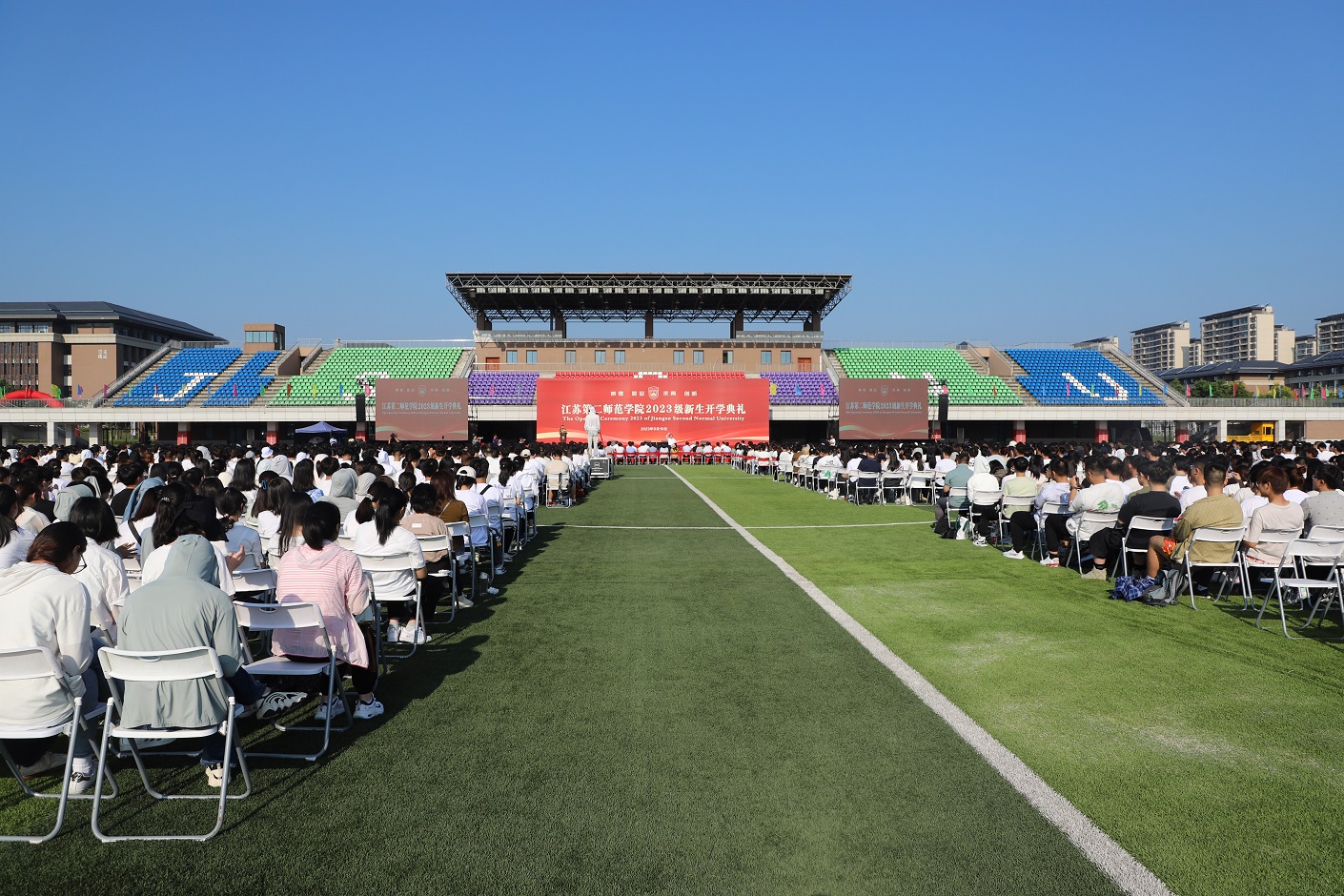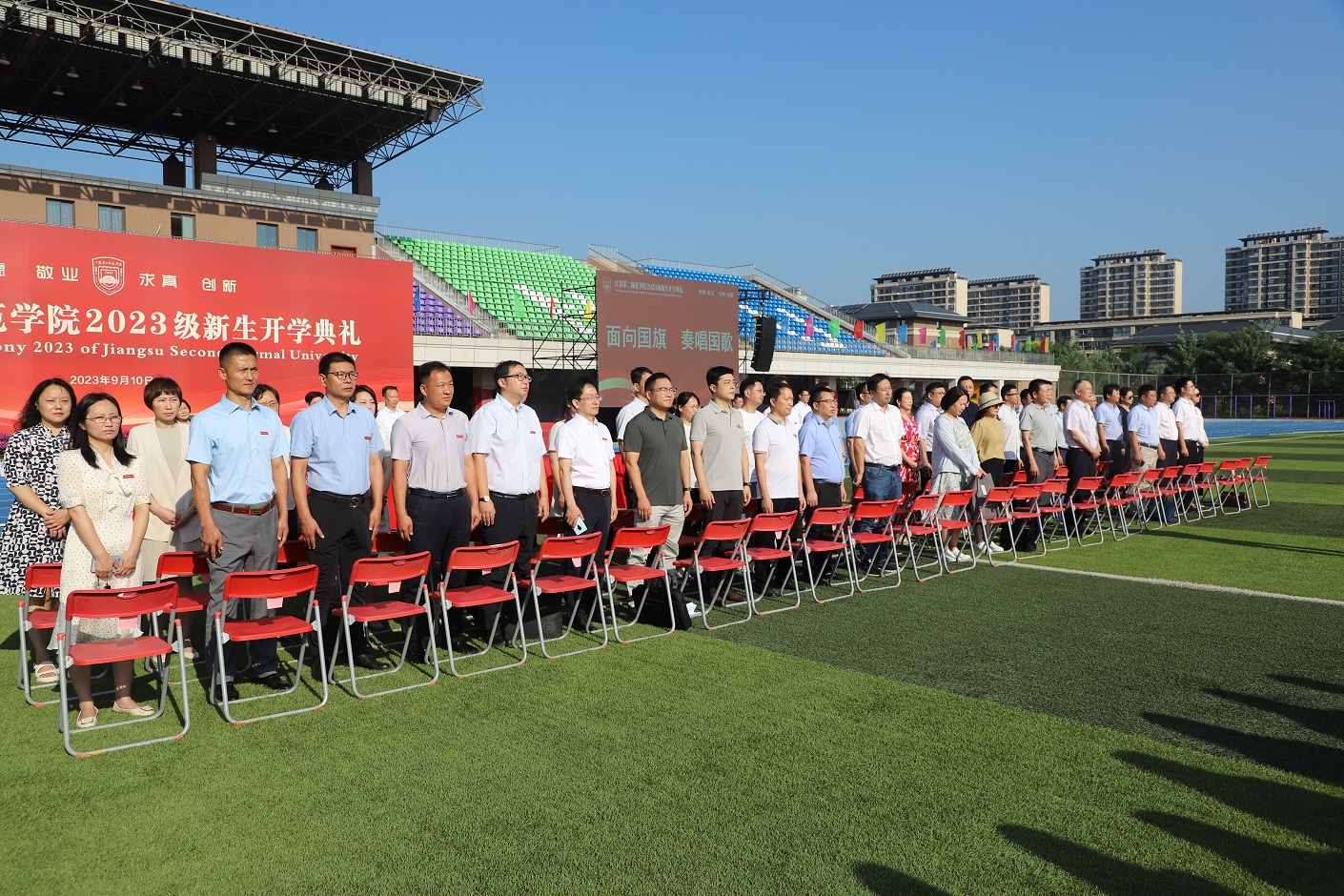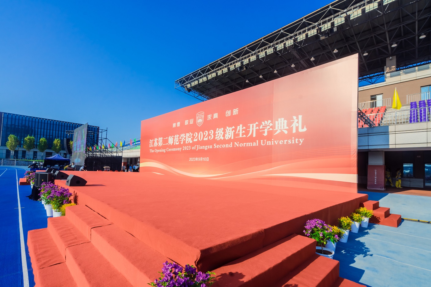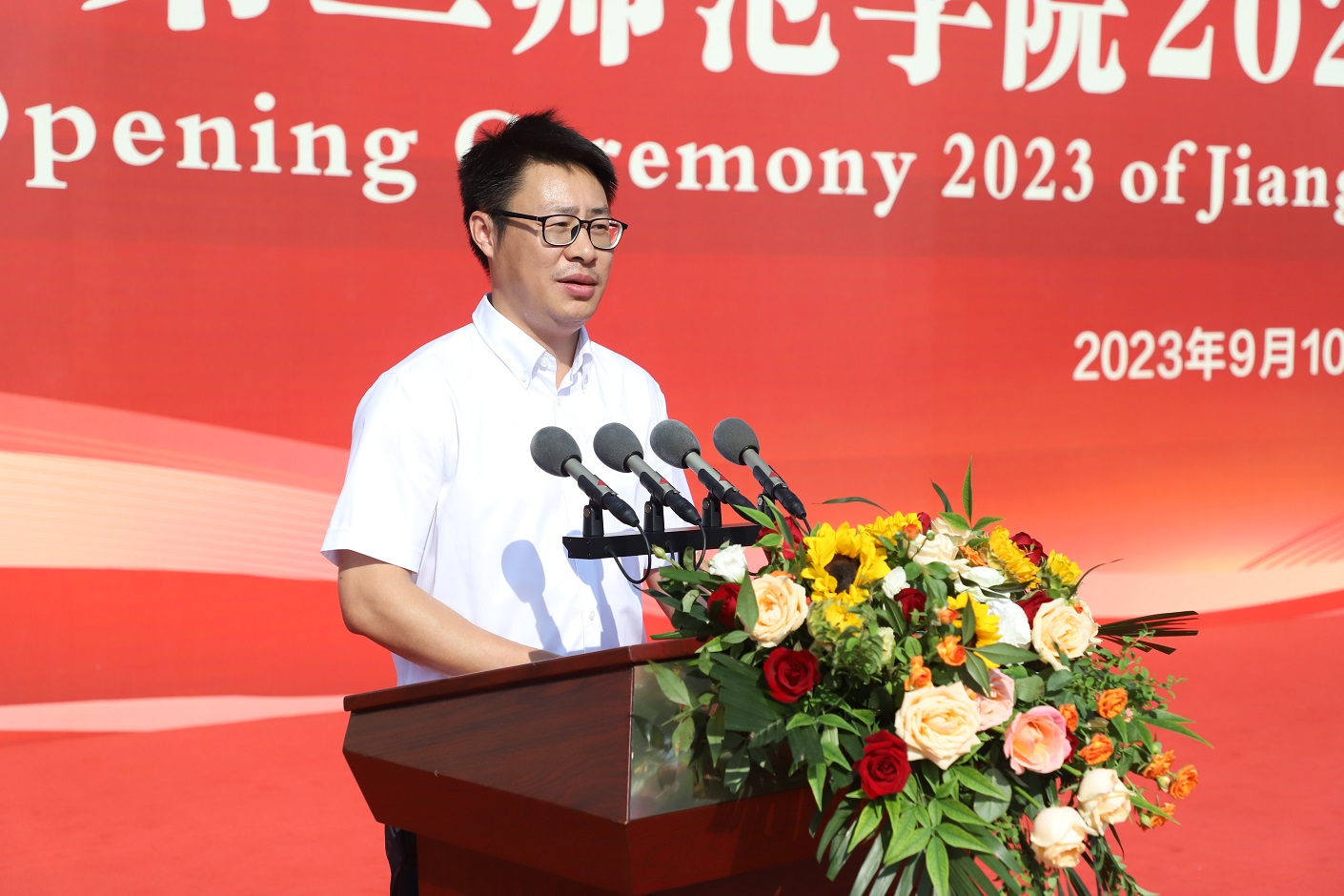 9月10日,我校2023级新生开学典礼在石湫校区举行。校党委书记王鲁沛、校长徐国华,校领导刘继红、崔燕、姚振标、皇甫立同、赵玉蓉、梅景辉、花书贵,各职能部门、二级学院负责人,教师代表、学生代表、家长代表,以及全校4000多名2023级新生,共聚一堂,学习习近平总书记重要指示精神,大力弘扬教育家精神,开启“躬耕教坛、强国有我”新篇章。典礼由党委副书记、副校长刘继红主持。