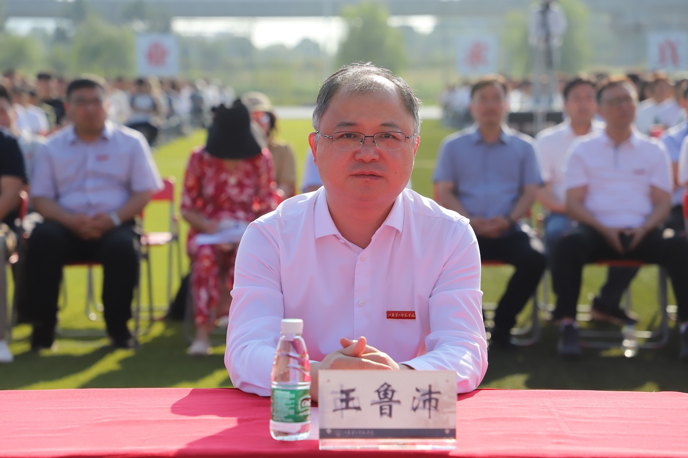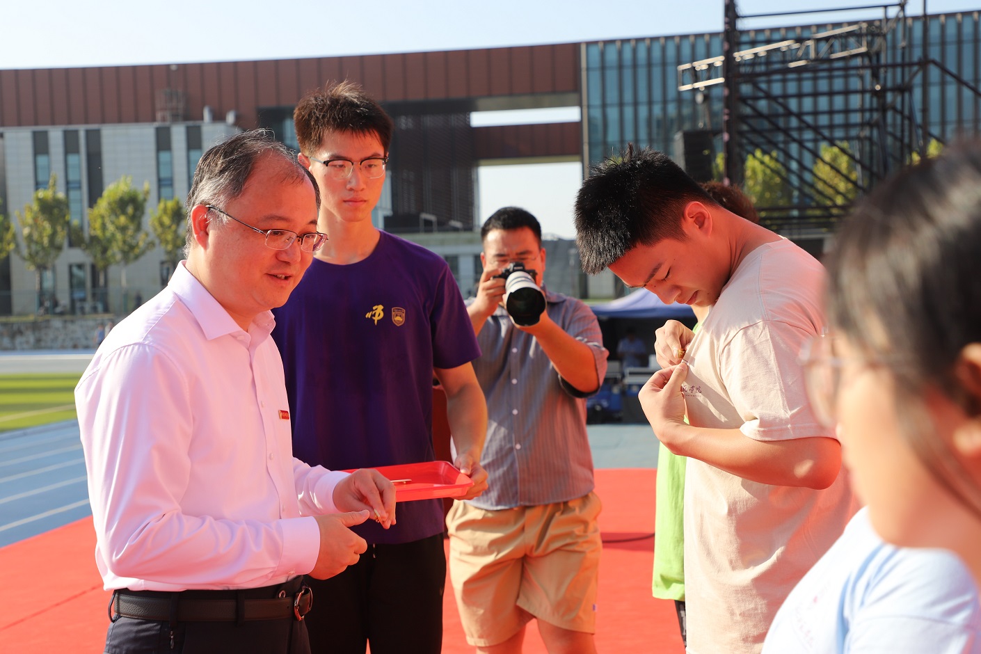 王鲁沛为新生代表颁发并佩戴校徽,全体新生们郑重地佩戴上江苏二师校徽。这枚校徽,不仅代表着“江苏二师人”的身份,更承载着江苏二师“崇德敬业,求真创新”的精神,承载着江苏二师人的教育强国的使命与荣光。王鲁沛勉励全体新生,希望大家以教育家为榜样,大力弘扬教育家精神,做到“心有大我、至诚报国的理想信念,言为士则、行为世范的道德情操,启智润心、因材施教的育人智慧,勤学笃行、求是创新的躬耕态度,乐教爱生、甘于奉献的仁爱之心,胸怀天下、以文化人的弘道追求。”