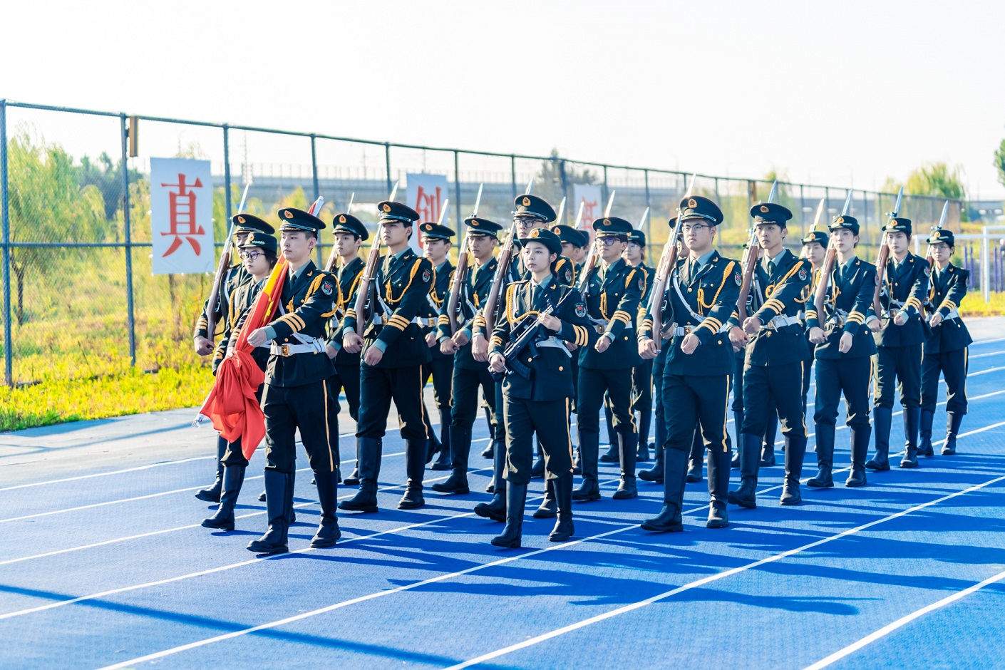 上午8时,国旗护卫队英姿飒爽、步履铿锵,托举着一面鲜艳的五星红旗步入典礼现场。五星红旗在庄严肃穆的国歌声中冉冉升起,全体师生庄严肃立,向国旗致敬。