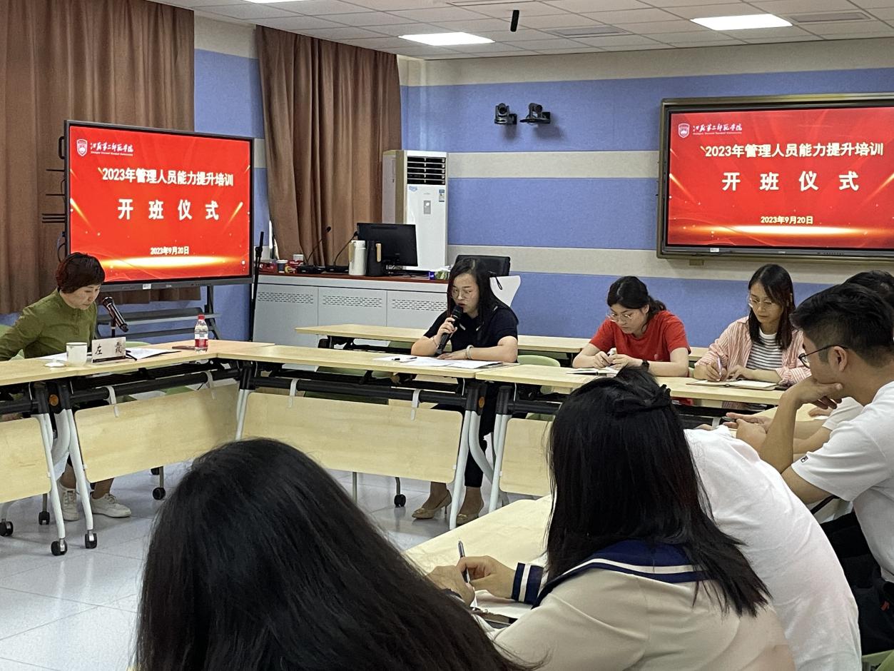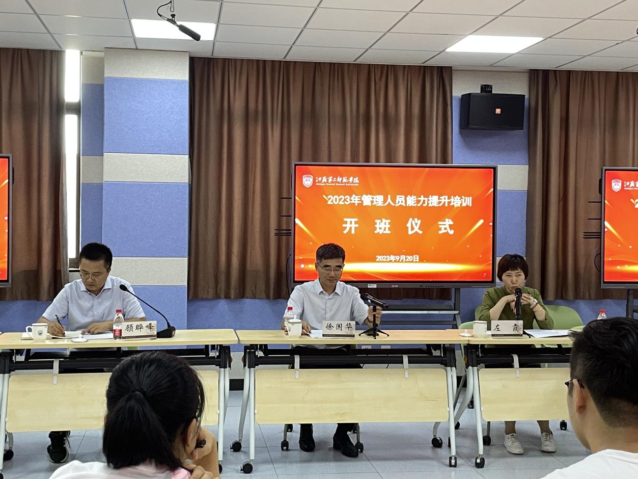 近日,我校在石湫校区崇文楼2-414报告厅举行管理人员能力提升培训班开班仪式。校长徐国华出席开班典礼,人事处处长左霞主持开班仪礼,教师教学发展中心负责人和40余名新进人员参加开班典礼。