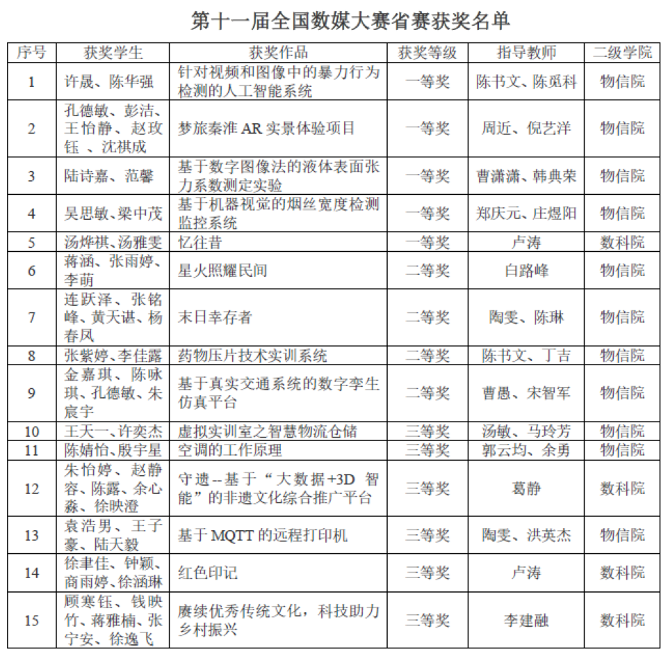 近日,第十一届全国大学生数字媒体科技作品及创意竞赛(以下简称全国数媒大赛)省赛成绩揭晓,我校学生在智能软硬件创意、智能产品设计、虚拟现实与游戏等赛道获一等奖5项、二等奖4项、三等奖6项,获得一、二等奖的作品将于11月10-11月13日代表我校参加全国总决赛。