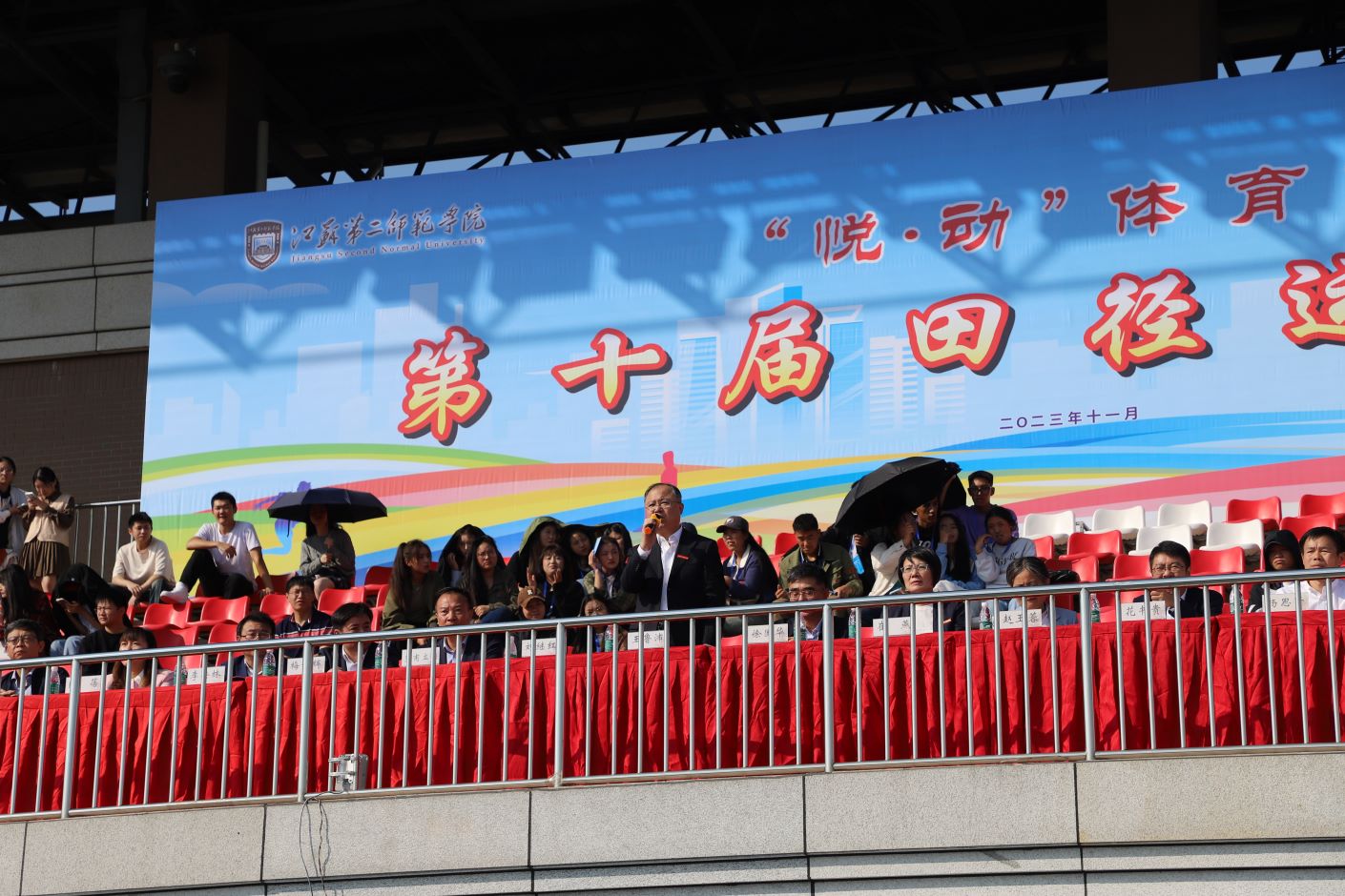 徐国华致开幕词。他说,我校高度重视体育工作,有着优良深厚的体育传统,自信自强、奋勇争先的体育精神始终在二师薪火相传。学校严格落实党和国家、省委省政府关于体育强国、体育强省建设决策部署,落实“五育并举”要求,举办了系列体育活动和运动赛事,形成了广大师生员工参加体育锻炼、参与体育竞技的运动热潮。习近平总书记指出,“为国争光、无私奉献、科学求实、遵纪守法、团结协作、顽强拼搏”的中华体育精神来之不易,要继承创新、发扬光大。徐国华希望同学们把这种精神延伸到学习和工作中,在建设特色鲜明高水平大学新征程上奋力奔跑、努力拼搏,争创佳绩。