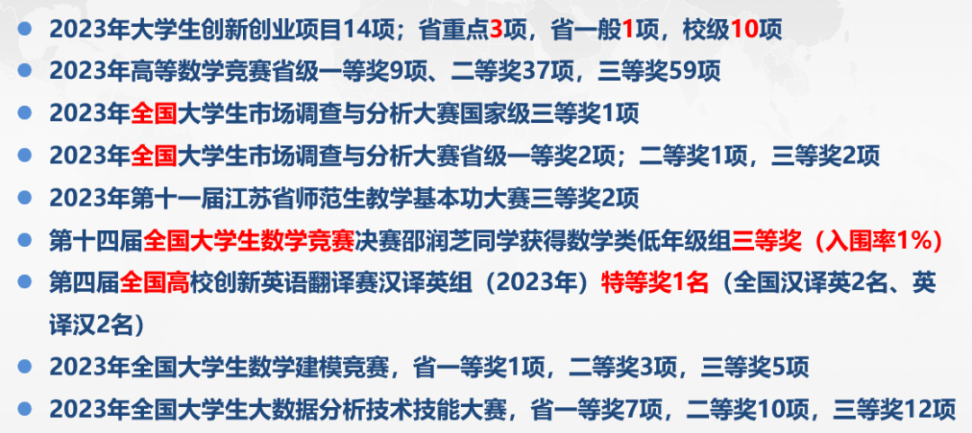 以学科竞赛平台为引导,夯实基础课程教学,发挥公共课程培育,强化实践教学环节,努力培养“就业有能力、深造有基础、发展有后劲儿”的综合型人才。近年来,学生参加各类学科竞赛多次获得国家级和省级奖项。今年,在大学生数学建模比赛、高等数学竞赛、全国大学生市场调研大赛、全国大学生数字媒体创意赛等比赛中均取得优异的成绩。
