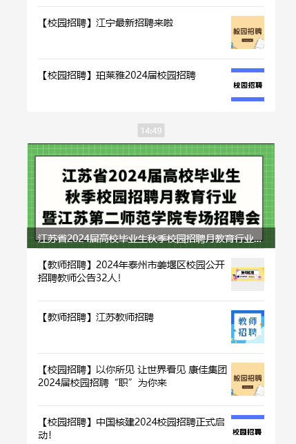 通过江苏第二师范学院就业创业信息网、“江苏二师就业办”微信公众号等新媒体平台每天更新发布各类符合我校毕业生就业信息。截止目前已发布就业信息1000余条,提供就业岗位1万余个。