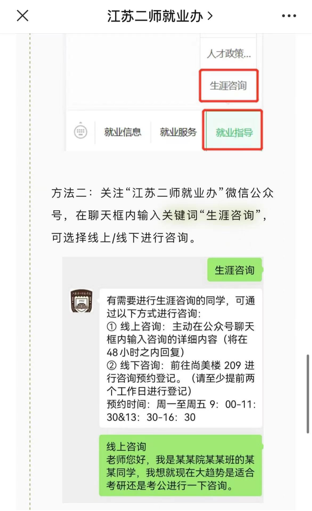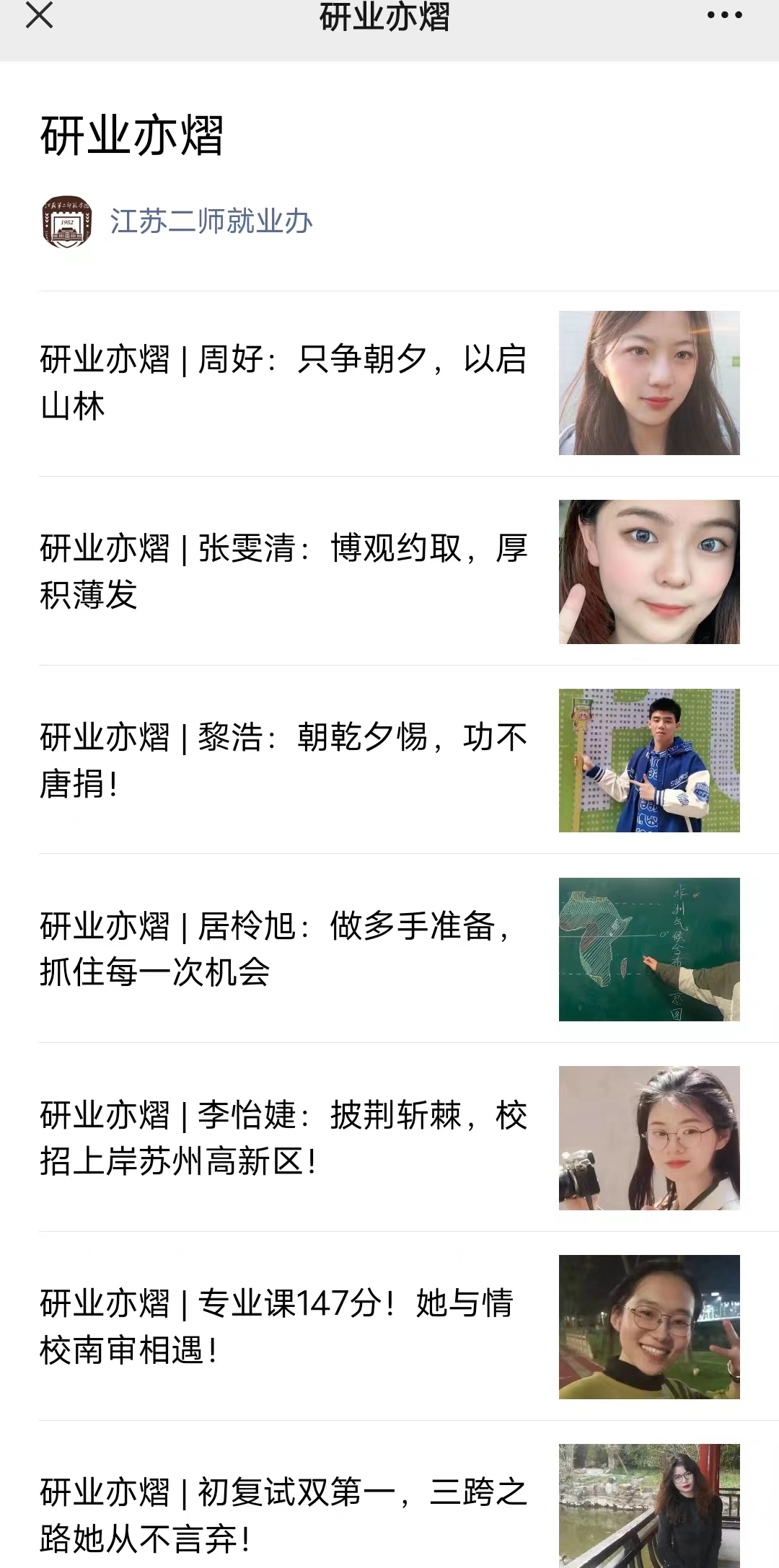 “江苏二师就业办”微信公众号设立“研业亦熠”专栏,宣传考研上岸学生,分享考研经验。
