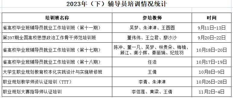 组建固定指导教师团队,并安排老师参加校外各级各类专业培训,提升教师业务能力。截止目前,本学期已安排22人次参加各级各类师资培训,做到了毕业班辅导员培训全覆盖。