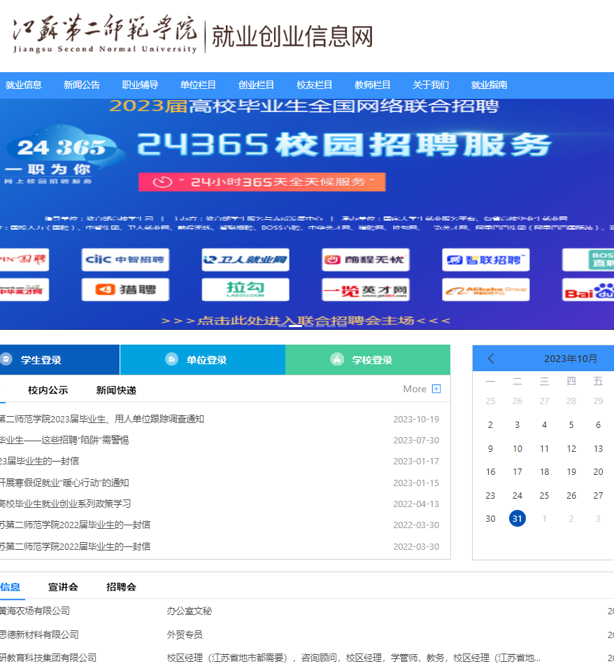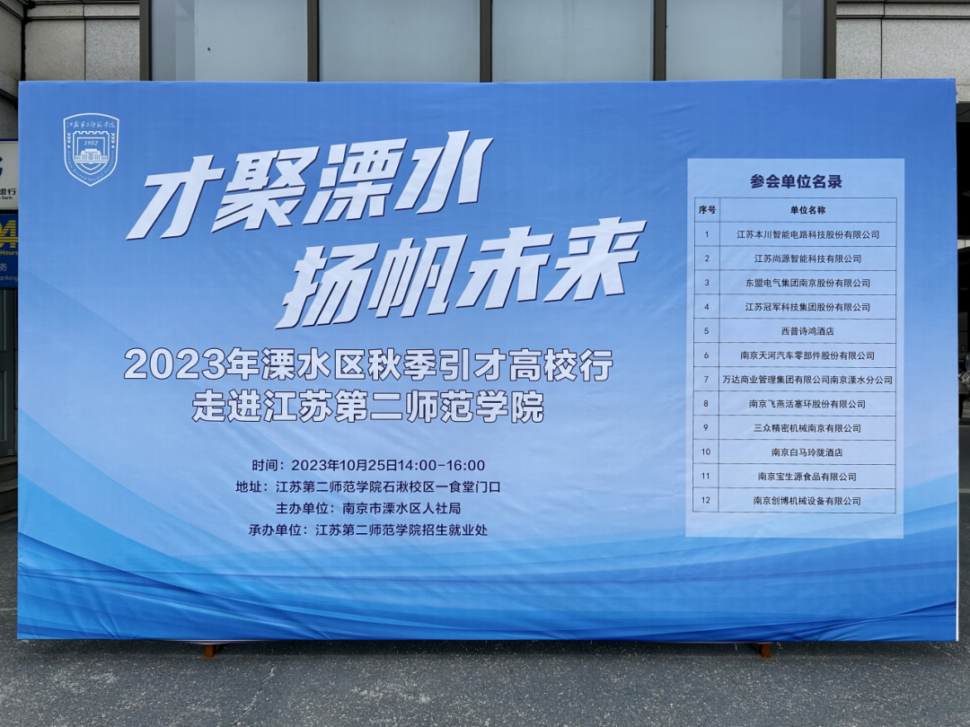 2023年10月25日,由溧水区人社局主办、江苏第二师范学院承办的“才聚溧水 扬帆未来”2023年溧水区秋季引才高校行走进江苏第二师范学院招聘会在石湫校区举办。本次招聘会共有12家溧水本土知名企业参加,涉及餐饮业、科技制造业、电气行业等,为毕业生提供230个就业岗位。