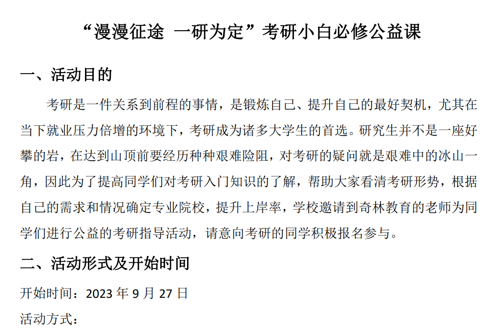 由考研培训机构提供各类考研公益讲座及公益课程,机构资质、讲座及课程内容由招就处先前进行审核把关。本学期已开展考研公益讲座5场,开展考研小白必修公益课及考研基础训练营直播课等系列考研基础课程培训。