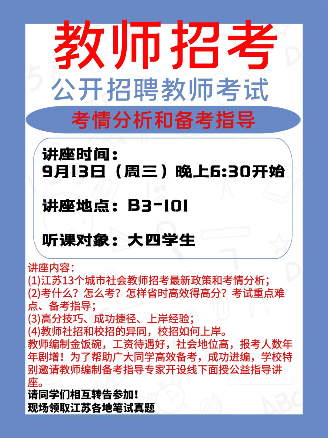 针对目前进行的教师校园招聘,开学以来,共开展教师考编公益讲座近10场,为毕业生解读各地考编政策及提供应试指导。