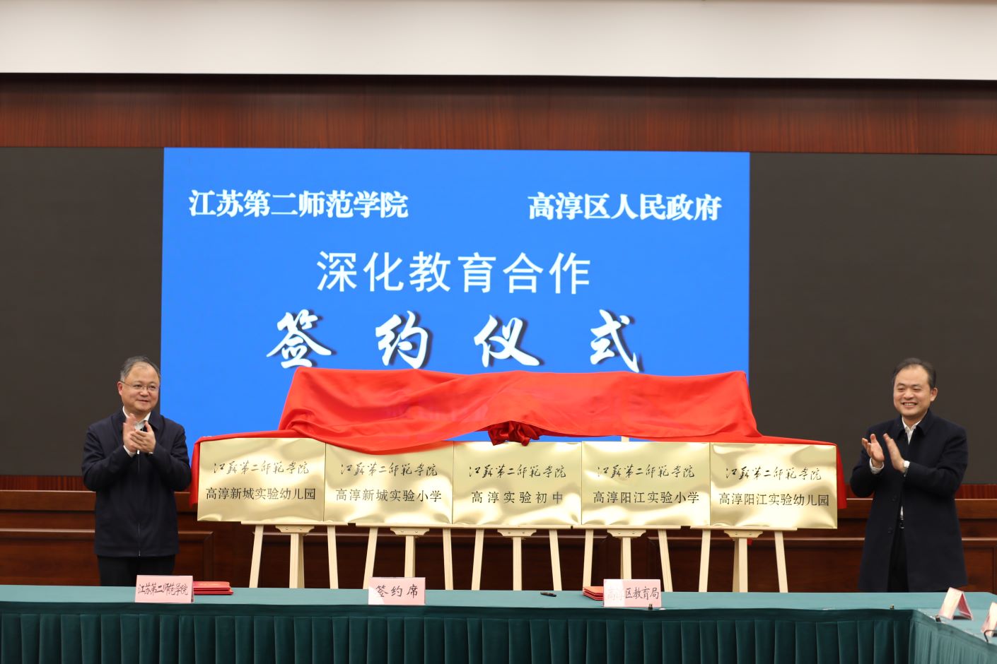 仪式上,徐国华与刘海军分别代表双方签署了教育战略合作协议。王鲁沛与蒋冰共同为双方首批合作共建的高淳实验初中、阳江实验小学、新城实验小学、阳江实验幼儿园、新城实验幼儿园等5所学校揭牌。