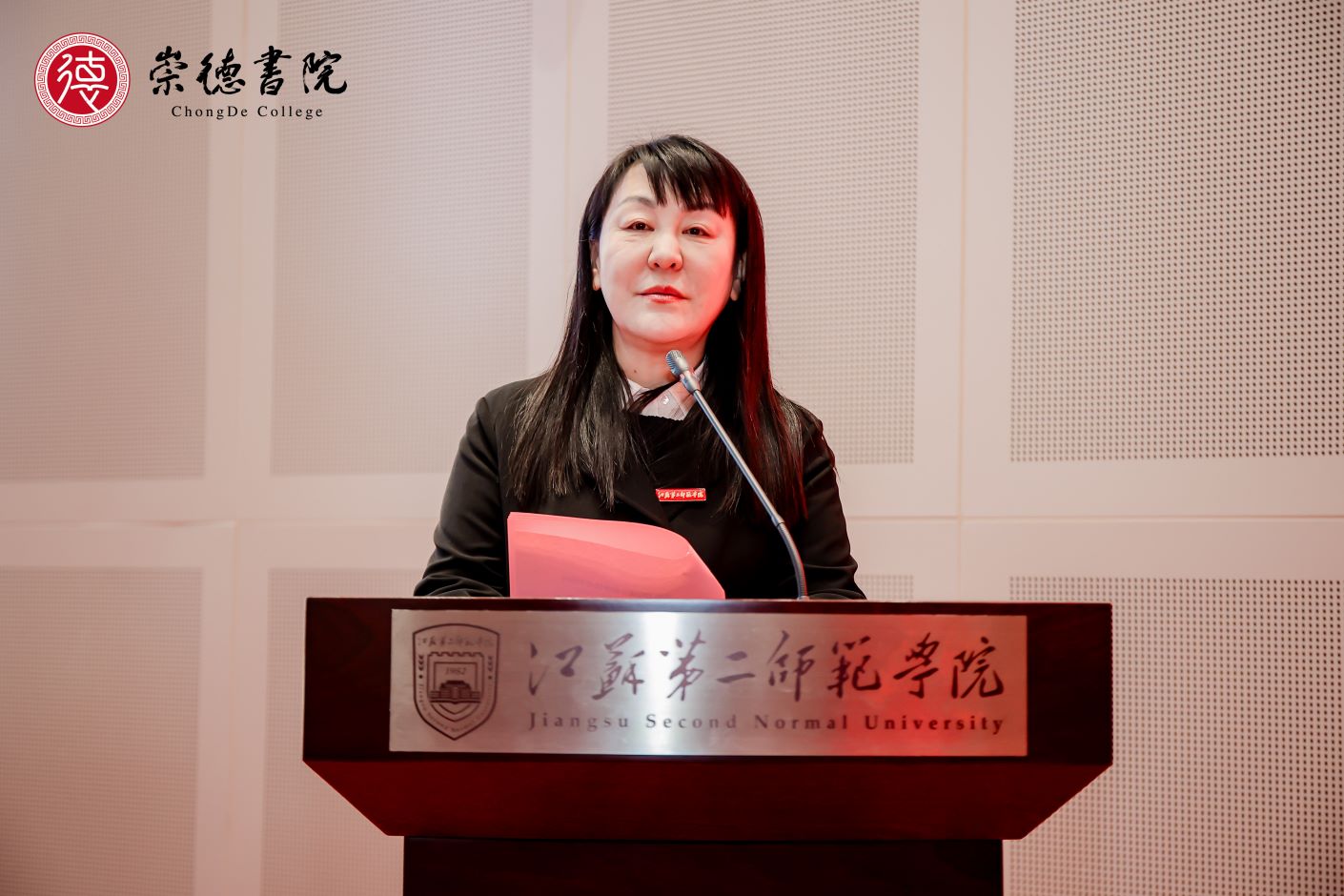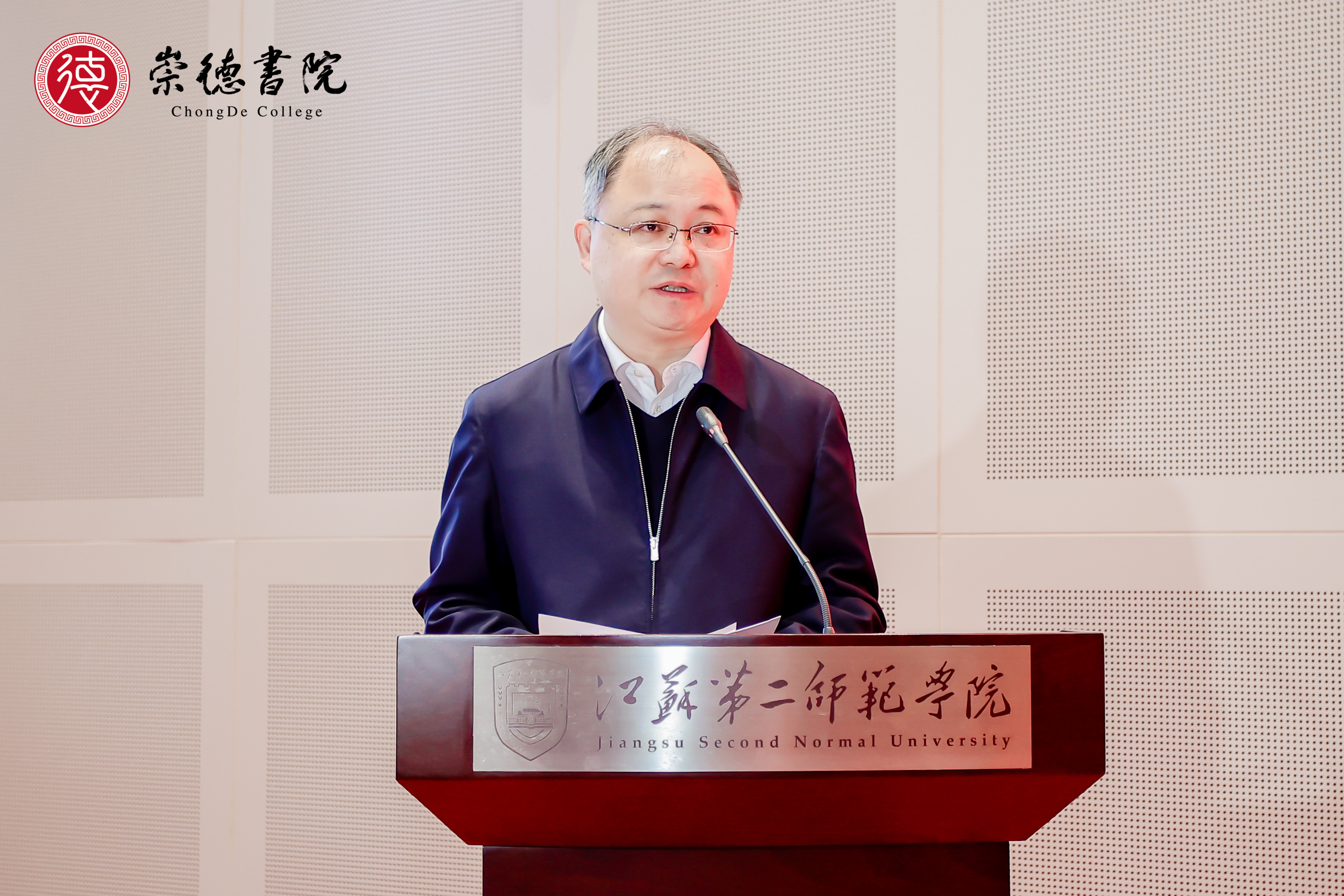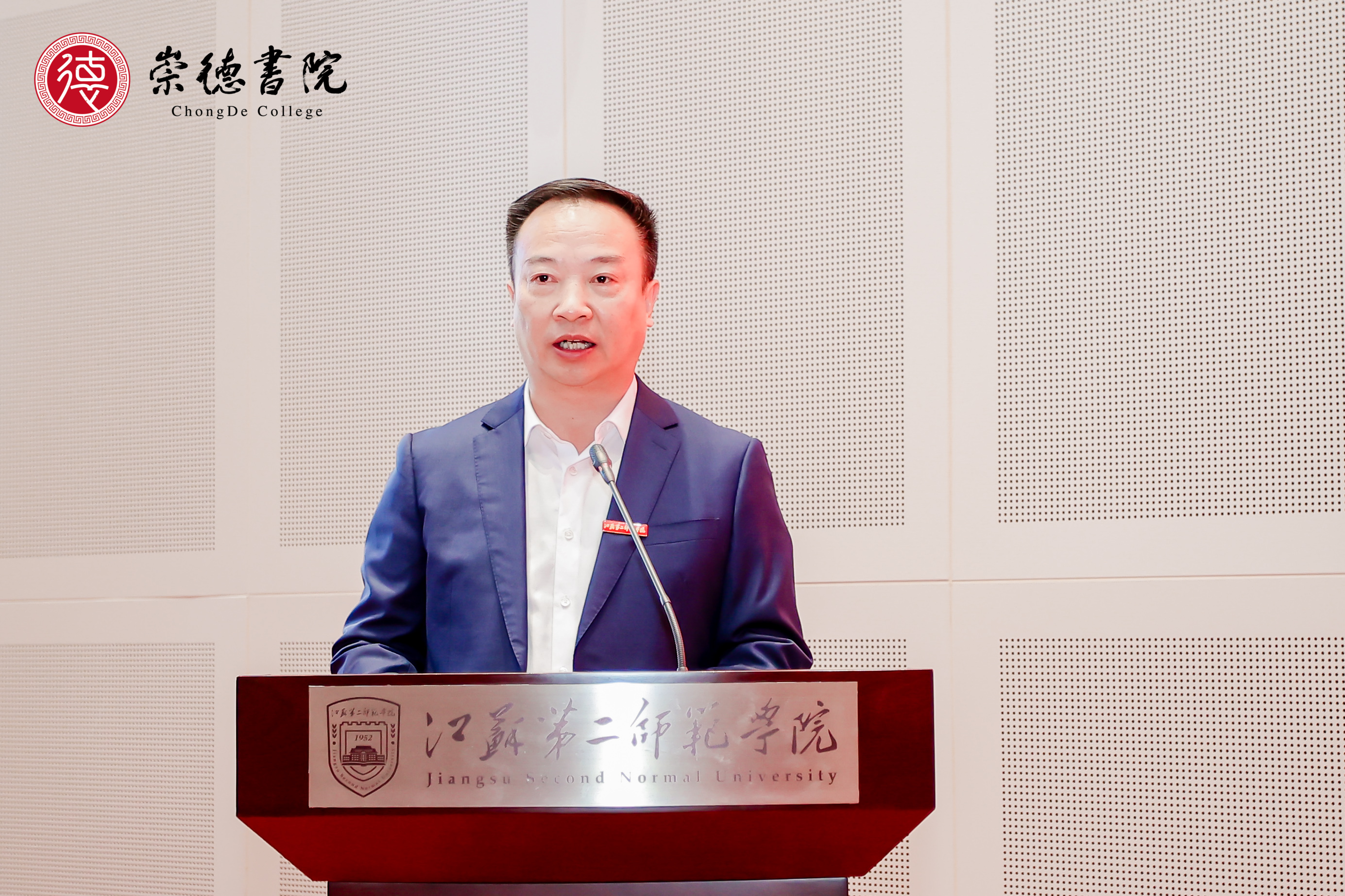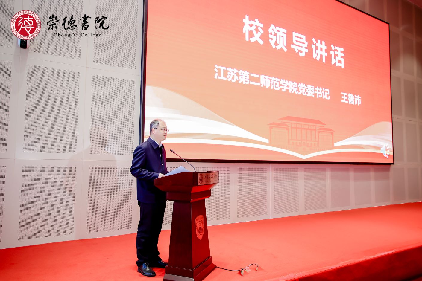 副校长皇甫立同发布了崇德书院标识。江苏省教育厅一级巡视员徐子敏、校党委书记王鲁沛共同为崇德书院揭牌。目前,“崇德书院”共有师范生2483名,书院以“崇德”命名,其核心理念是希望在师范生的道德修为方面下功夫,通过润物无声的思政教育,养成学生心有大我、至诚报国的理想信念和言为士则、行为世范的道德情操;通过固本培优的学科教学,给予学生启智润心、因材施教的育人智慧和勤学笃行、求是创新的躬耕态度;通过广大精微的通识教育,启发学生乐教爱生、甘于奉献的仁爱之心和胸怀天下、以文化人的弘道追求。