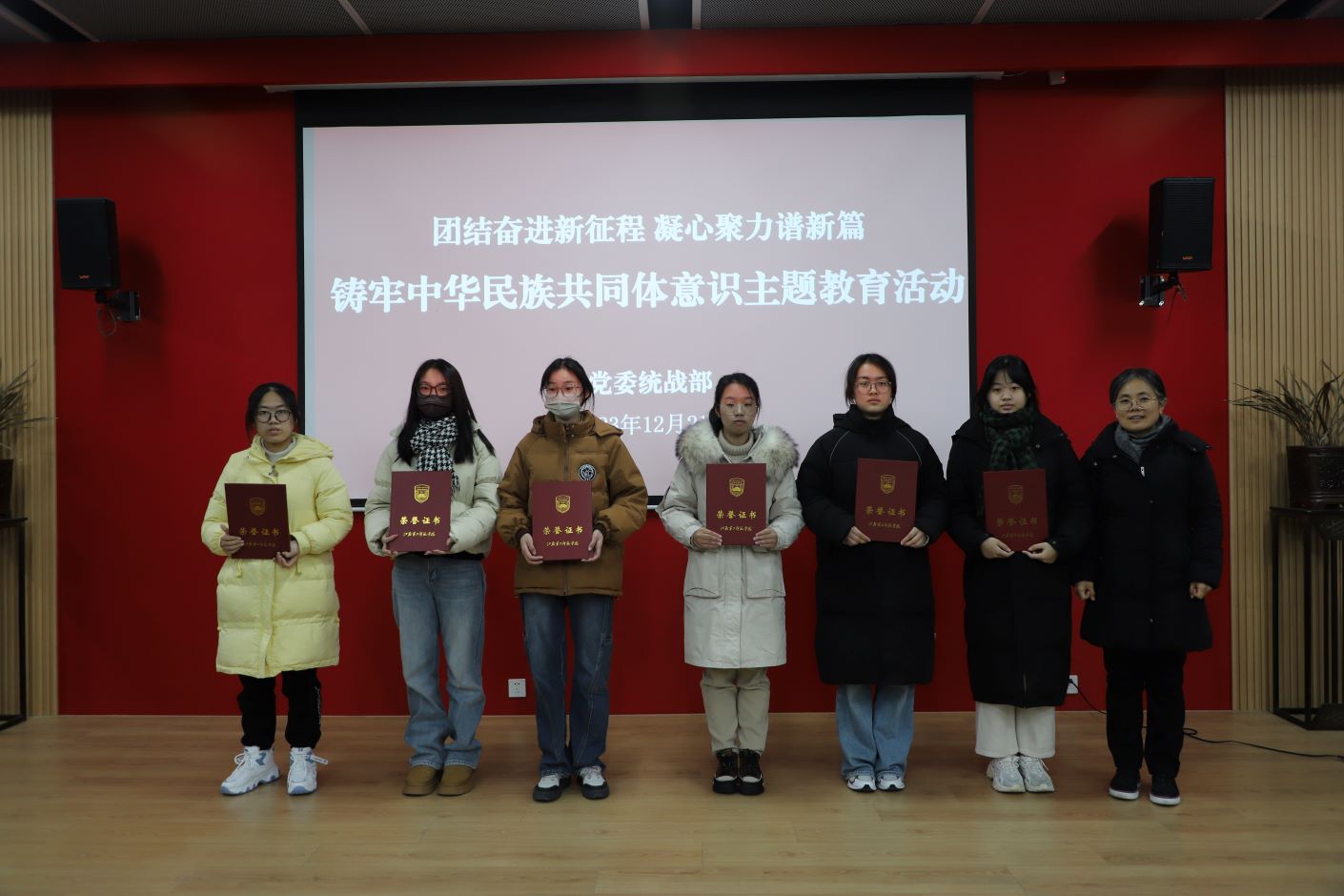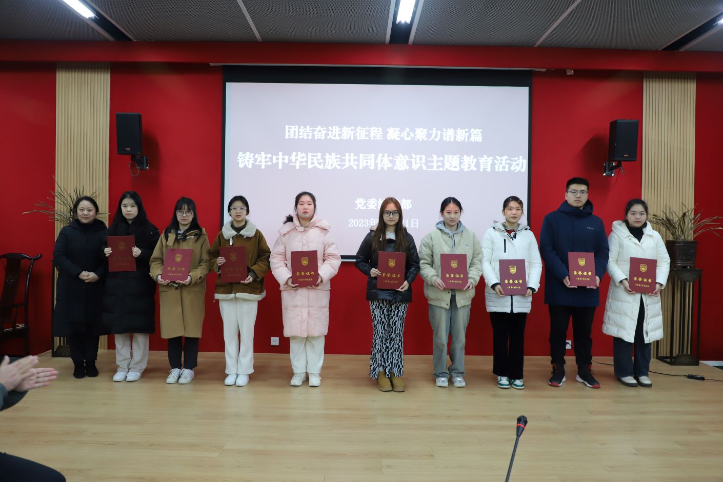 会上,赵玉蓉和孙婷共同为在民族团结进步月作品征集中获奖的学生代表颁奖。李安林领学了关于习近平总书记在中共中央政治局第九次集体学习时的重要讲话精神等内容。
