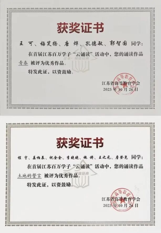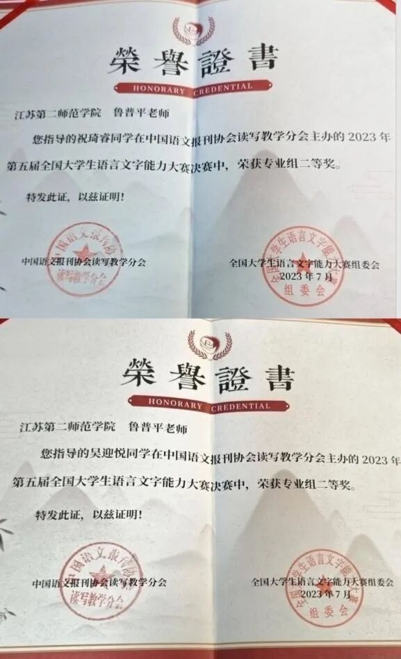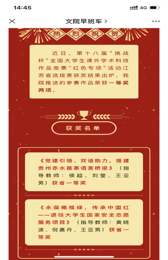 学院坚持以学风建设辐射带动人才培养质量提升,建学风、强学风、优学风,推进思想政治工作,提升学生核心竞争力。一是学生中心建学风,学院依据专业特色和学生特点,精心为全体学生量身定制《文学院学生学业规划手册》,探索建立四年一贯制大学生职业生涯规划体系;将新生适应教育与思政工作相融合,开展“灼灼芳华,与‘新’同行”新生入学教育系列活动,增强新生融入感、归属感;将学业指导与思政工作相融合,面向二、三年级开展学业规划调研,全面掌握学生四六级考试、计算机考试、教师资格证通过情况,动态掌握学生学业发展状态;将就业指导与思政工作相融合,针对毕业生实际就业需求,开设文学院毕业生备考室,开展考研冲刺慰问,分类召开就业动员会;常态化开展“嘤鸣”“笃行”“木铎”系列讲座,全面助推营造良好学风。二是依托赛事强学风,学院鼓励并组织学生参加各类专业赛事,以赛促练,以赛促学。文学院学子在第十八届“挑战杯”全国大学生学术科技作品竞赛“红色专项”活动获江苏省选拔赛一等奖两项,《党建引领、双语助力,搭建贵州赤水苗寨语言桥梁》深入贵州赤水乡村,助力贵州乡村振兴,《永葆橄榄绿,传承中国红—退役大学生国家安全志愿服务项目》以退役大学生士兵为主力,组建国家安全教育志愿服务队,弘扬红色文化,普及安全知识;在江苏大学生读书文化节活动中获首届江苏大学生书评大赛一等奖1项,二等奖4项;两部朗诵作品入选首届江苏百万学子“云诵读”优秀作品。三是创新活动优学风。面向全体学生开展“晨曦计划”“锄星计划”早晚自习打卡活动;举办“丹青写初心,翰墨忆长征”书法大赛,提升师范生专业技能。