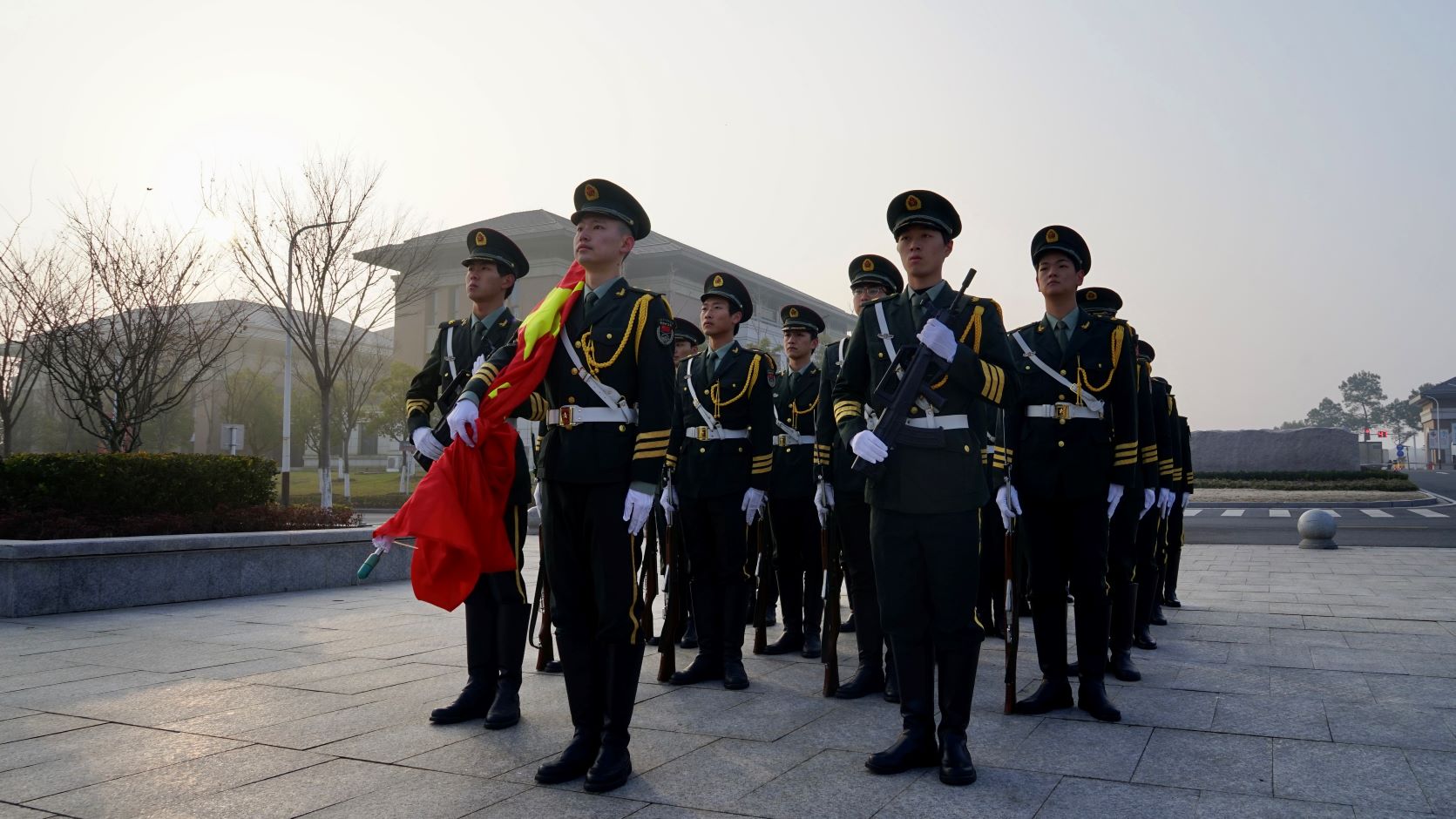 校国旗护卫队踏着铿锵有力的步伐,护送国旗至升旗台,国歌响起,全体师生庄严肃立,行注目礼,鲜艳的五星红旗在雄壮的国歌声中冉冉升起。