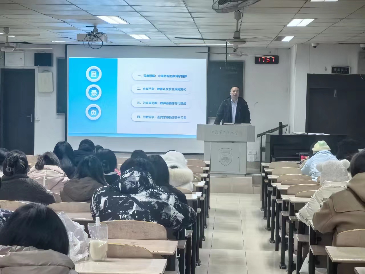 党委书记王鲁沛以《弘扬践行教育家精神,全面贯彻党的教育方针》为题,结合学习贯彻习近平总书记关于教育的重要论述和教师节重要指示精神,就贯彻落实党的教育方针、弘扬践行教育家精神、立志做新时代“大先生”等话题,与同学们畅谈体会与思考。王鲁沛解读了“教育家精神”,阐释了教育家精神的深刻内涵和时代意义。他希望同学们深入学习贯彻习近平总书记重要指示精神,大力弘扬践行教育家精神,坚定心有大我、至诚报国的理想信念,恪守言为士则、行为世范的道德情操,涵养启智润心、因材施教的育人智慧,砥砺勤学笃行、求是创新的躬耕态度,秉承乐教爱生、甘于奉献的仁爱之心,矢志胸怀天下、以文化人的弘道追求,争做“四有”好老师和育人“大先生”。王鲁沛指出,教育家精神的六个特征,是以全面贯彻党的教育方针为总的精神引领。他从党的教育方针、中国教育所处的历史方位、落实好立德树人根本任务等方面,详细阐述了党的教育方针与教育改革发展历程。他强调,我们党关于教育方针的表述体现了鲜明的时代特色和与时俱进的探索精神,对党的教育方针必须准确把握、全面贯彻。王鲁沛勉励同学们坚定理想信念、锤炼过硬本领、彰显青春作为,将个人理想融入伟大事业,牢记“为何奋斗”、坚定“为谁奋斗”、回答“怎样奋斗”、诠释“继续奋斗”,在青春赛道上跑出这一代青年的最好成绩。他希望同学们从教育家精神中汲取奋进动力,珍惜时光,刻苦学习,砥砺品格,全方位提升作为未来教师的综合素质,为加快建设教育强国,实现民族伟大复兴作出应有贡献。