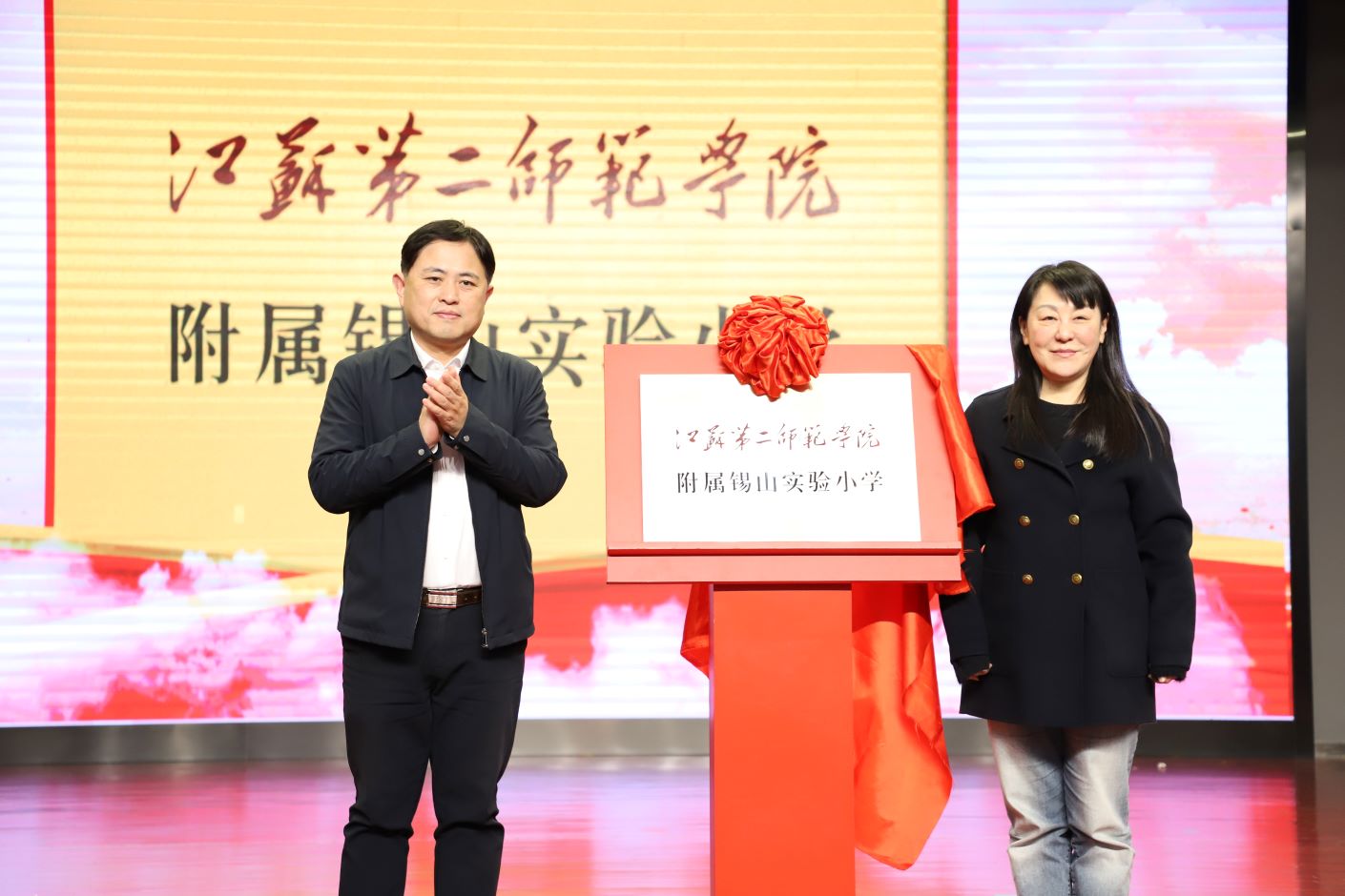 顾凤艳致欢迎词,向附属锡山实验小学揭牌表示祝贺,希望学校借力高校优质资源,加强师资队伍建设,服务学生全面发展。刘继红与张迪秋共同为“江苏第二师范学院附属锡山实验小学”揭牌。