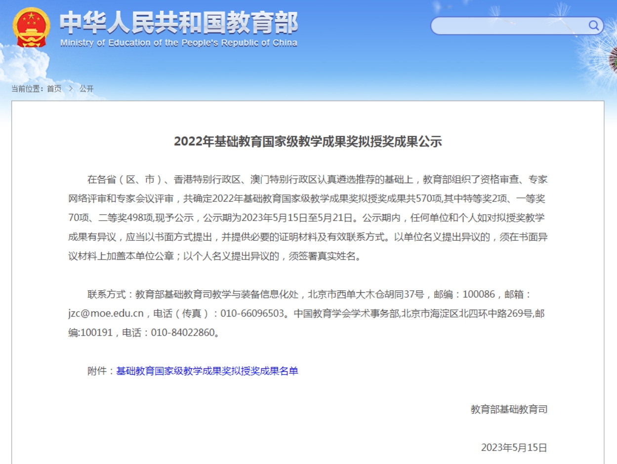 在教育部发布的《2022年基础教育国家级教学成果奖拟授奖成果公示》文件中,我校共有2项教学成果获奖。此次获奖在奖项等级和数量上都实现了历史新突破!