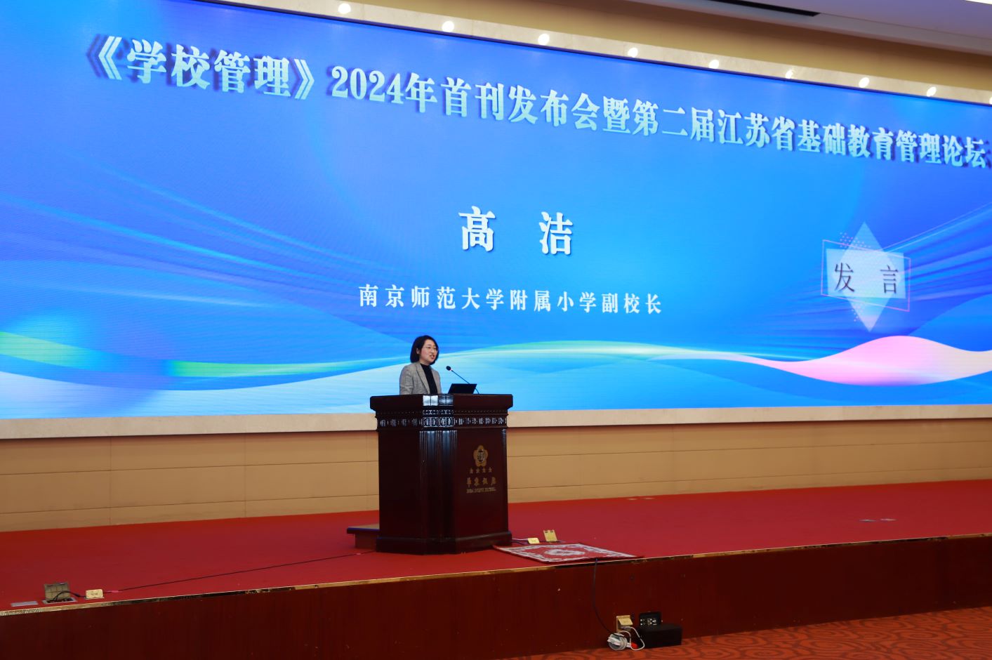学术支持单位代表南京师范大学附属小学副校长高洁发言。高洁指出,《学校管理》在40年的发展历程中,大力发掘、精心提炼、及时传播基础教育学校改革中的生动案例和实践智慧,密切联系一线学校,与南师大附小教育集团形成相互促进的学术支持合作体系,也已成为引领江苏教育理论与实践、学校管理理论和探索相结合的重要平台。她表示期待《学校管理》焕新升级,以创新的姿态更加全面深入反映基础教育高质量发展与研究的新经验、新成果。