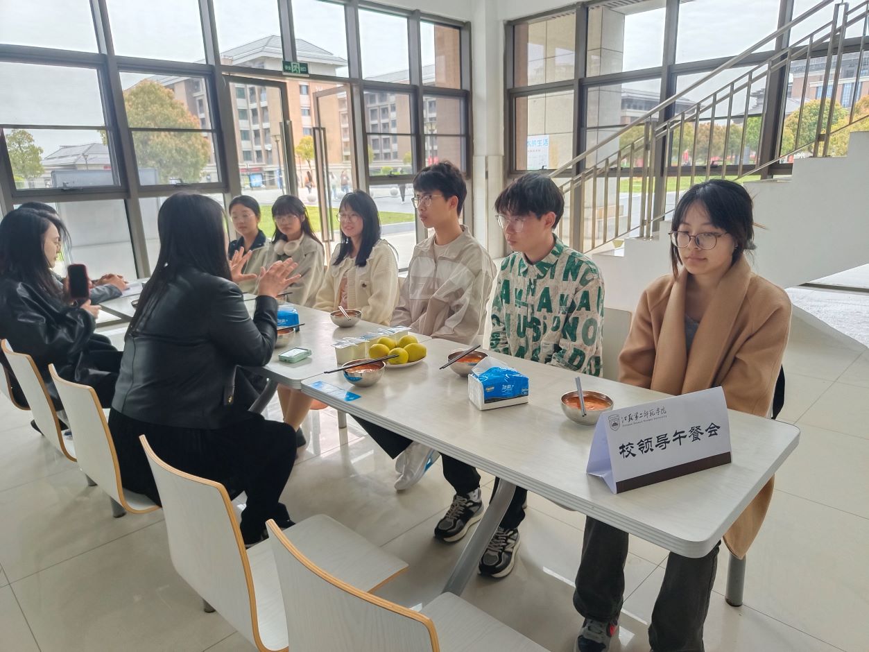 6位同学中除了1位是毕业生,其余5位都是2023级新生。校领导午餐会的通知一经“江苏二师学工”微信公众号发布,他们就报名参加,因报名最早而获得机会与校领导零距离交流的机会。他们难掩兴奋和喜悦,踊跃发言,分别就经典阅读、宿舍生活、实习实践、专业学习、深造出国等方面的感受和想法畅所欲言,也把自己遇到的困难和疑问和盘托出,更是对学校的意见和建议直言不讳。