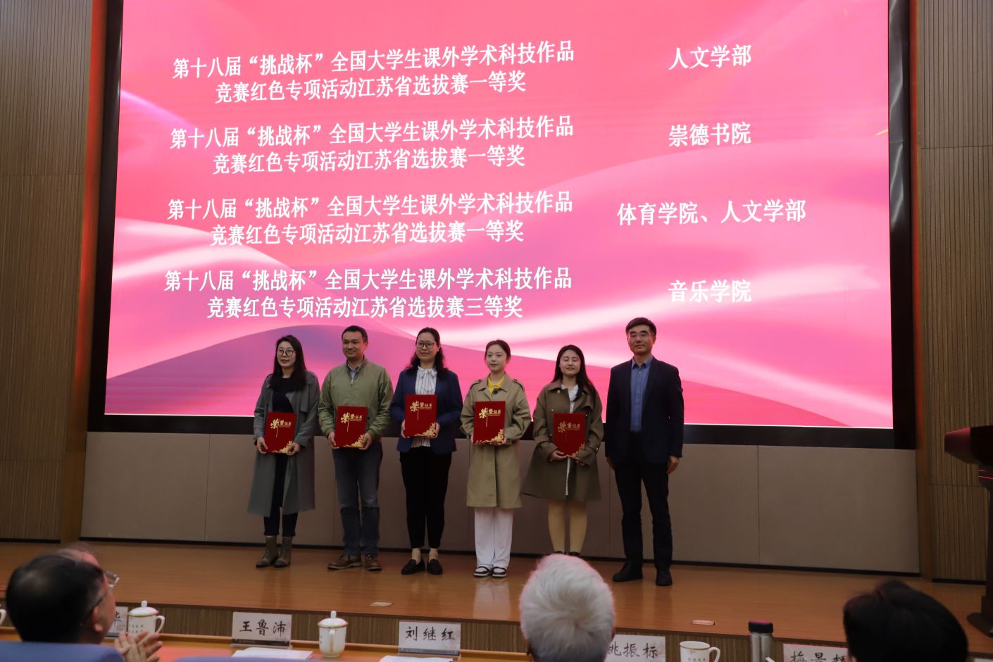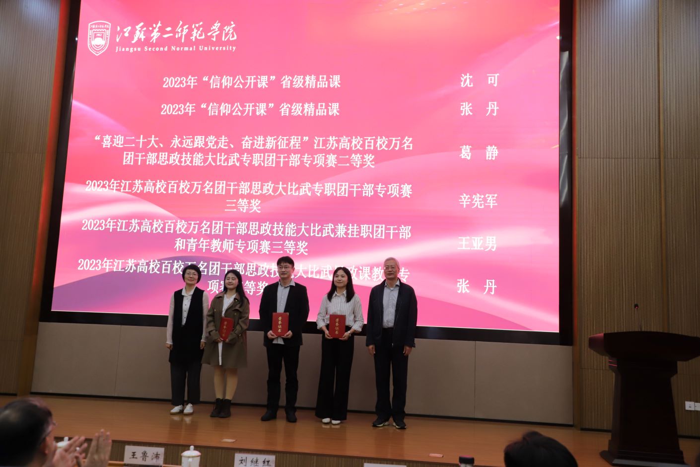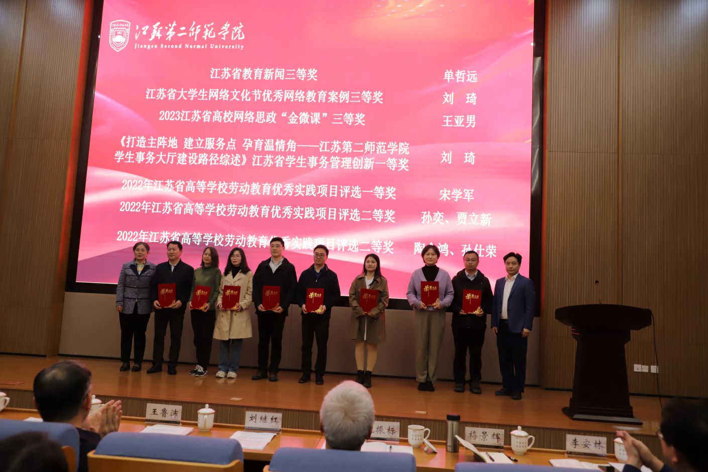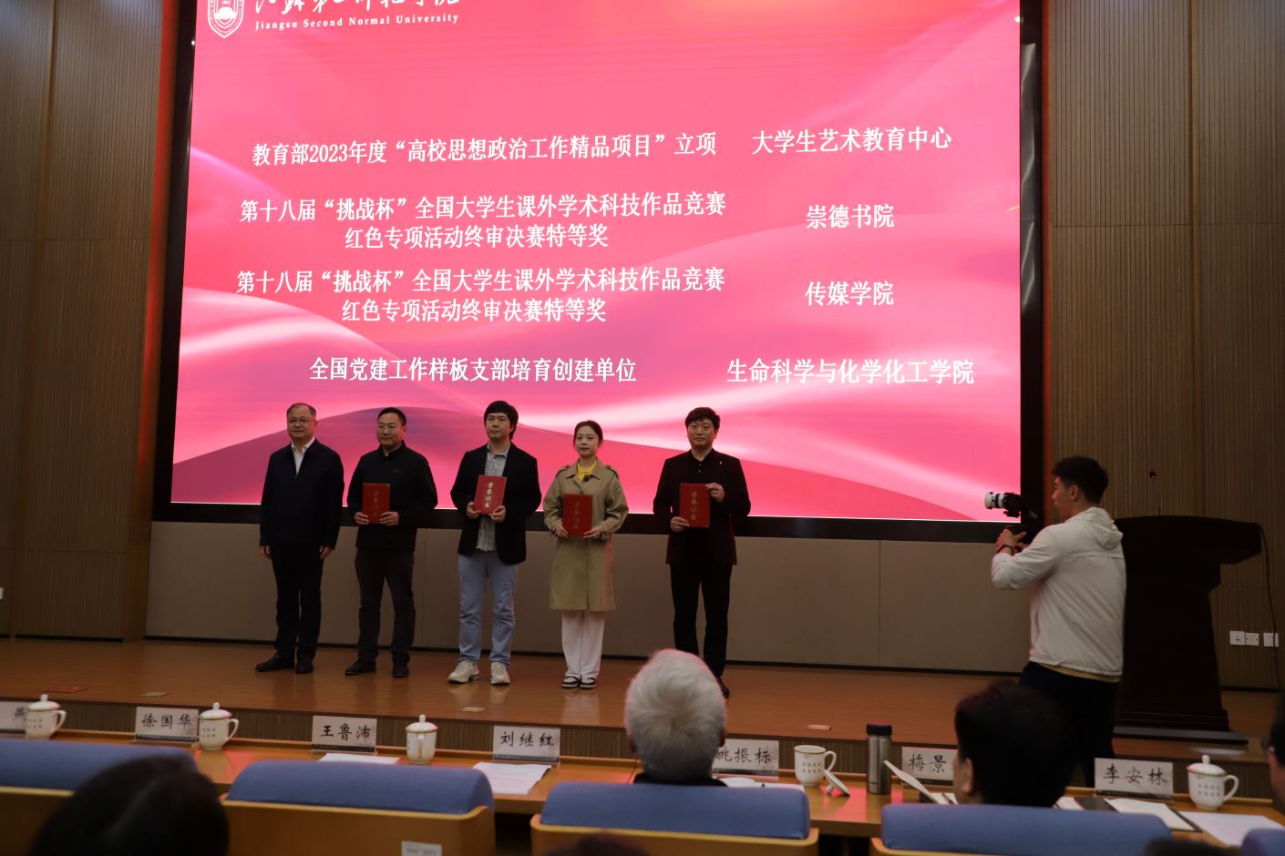 会议对近年来在思想政治工作领域取得成绩的单位、团队、个人进行了表彰。王鲁沛为教育部2023年度“高校思想政治工作精品项目”、“挑战杯”红色专项决赛特等奖、全国党建工作样板支部培育创建单位颁奖;徐国华为“挑战杯”红色专项全国特等奖团队颁奖;崔燕、姚振标为江苏省共青团工作获奖者颁奖;赵玉蓉、梅景辉为江苏省宣传思想领域工作获奖者颁奖。