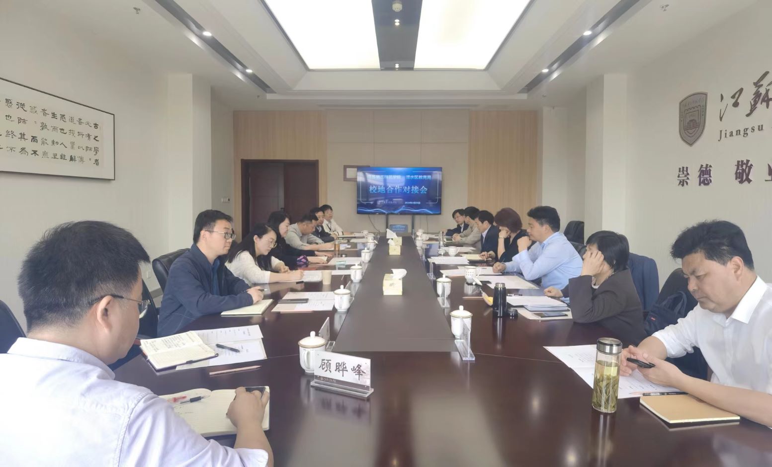 4月25日,党委副书记、副校长刘继红主持召开校地合作对接会,与来访的溧水区教育工委书记、区教育局局长、一级调研员肖霞一行就深化校地战略合作进行深入交流。区教育工委委员、区教发中心主任胡新春,区教发中心正主任级干部胡爱国,区教育工委委员、区教育局副局长李德琴,区教发中心副主任李晓刚等出席对接会。