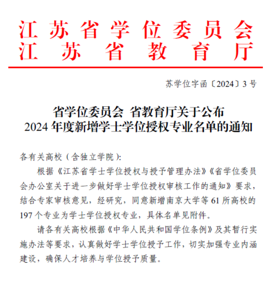 日前,江苏省学位委员会、教育厅发布《省学位委员会省教育厅关于公布2024年度新增学士学位授权专业名单的通知》(苏学位字函〔2024〕3号),我校经济与金融专业顺利通过新增学士学位授权专业审核,获得学士学位授予权。