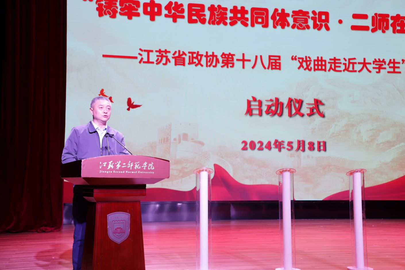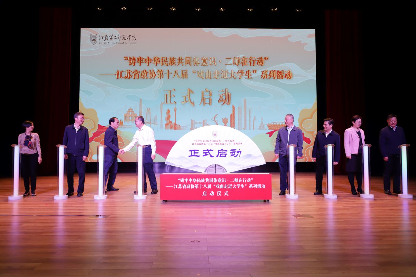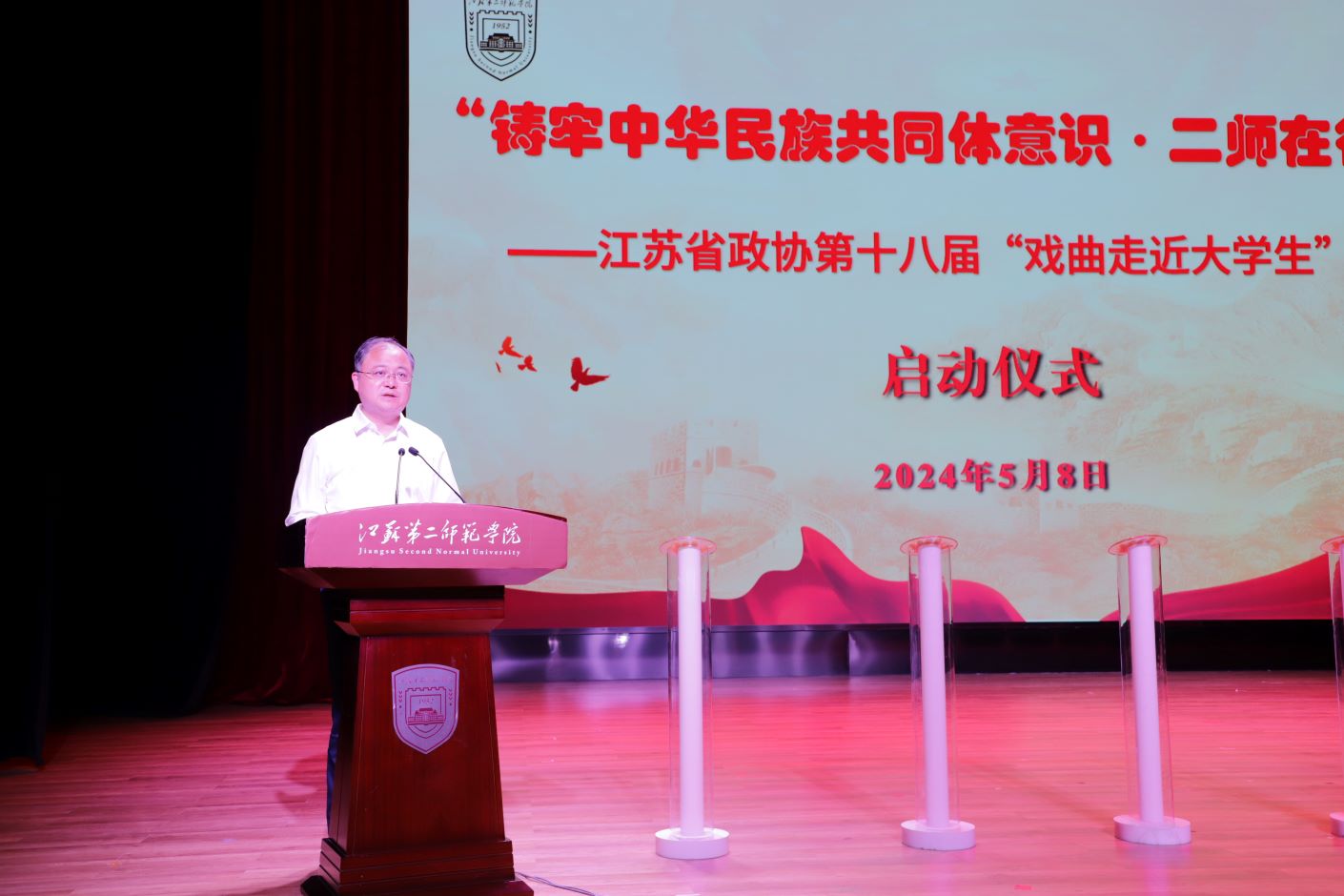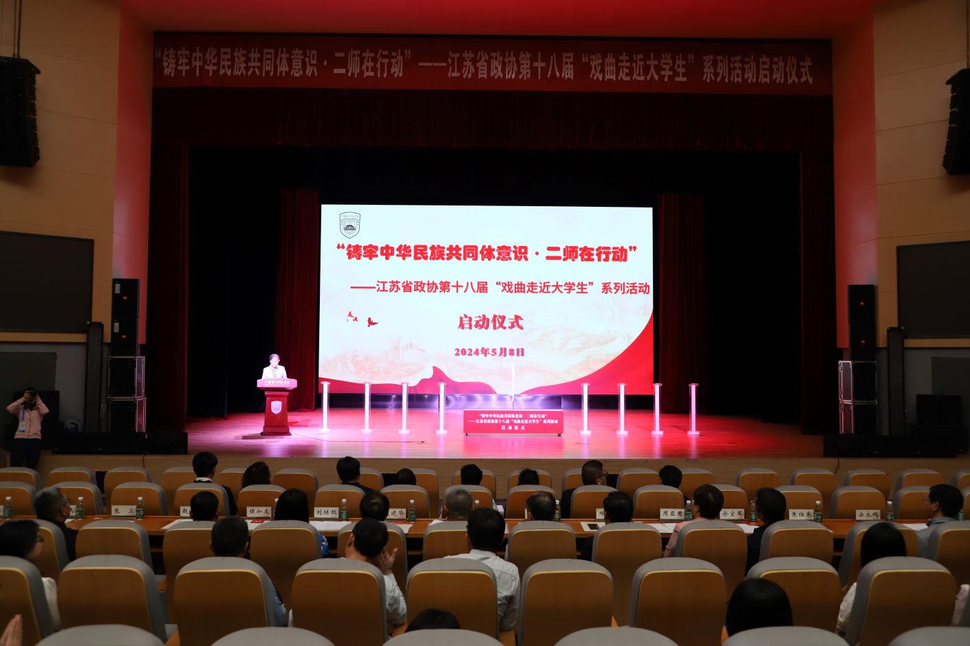 5月8日,“铸牢中华民族共同体意识·二师在行动”——江苏省政协第十八届“戏曲走近大学生”系列活动启动仪式在我校石湫校区尚美楼报告厅举办。江苏省政协文化文史和学习委员会副主任孙越,江苏省民族宗教事务委员会副主任邓飞,江苏省教育厅二级巡视员周亚君,江苏省政协副秘书长、农工党江苏省委会专职副主委袁建华,江苏省委统战部二处一级调研员侯加友,南京市鼓楼区委常委、统战部部长徐宝军,南京市溧水区委统战部副部长、民宗局局长高明芳;我校党委书记王鲁沛,党委副书记、副校长刘继红,副校长赵玉蓉出席启动仪式。我校统一战线领导小组,各学院(学部、书院)党委主要负责人和师生代表参加启动仪式。启动仪式由赵玉蓉主持。