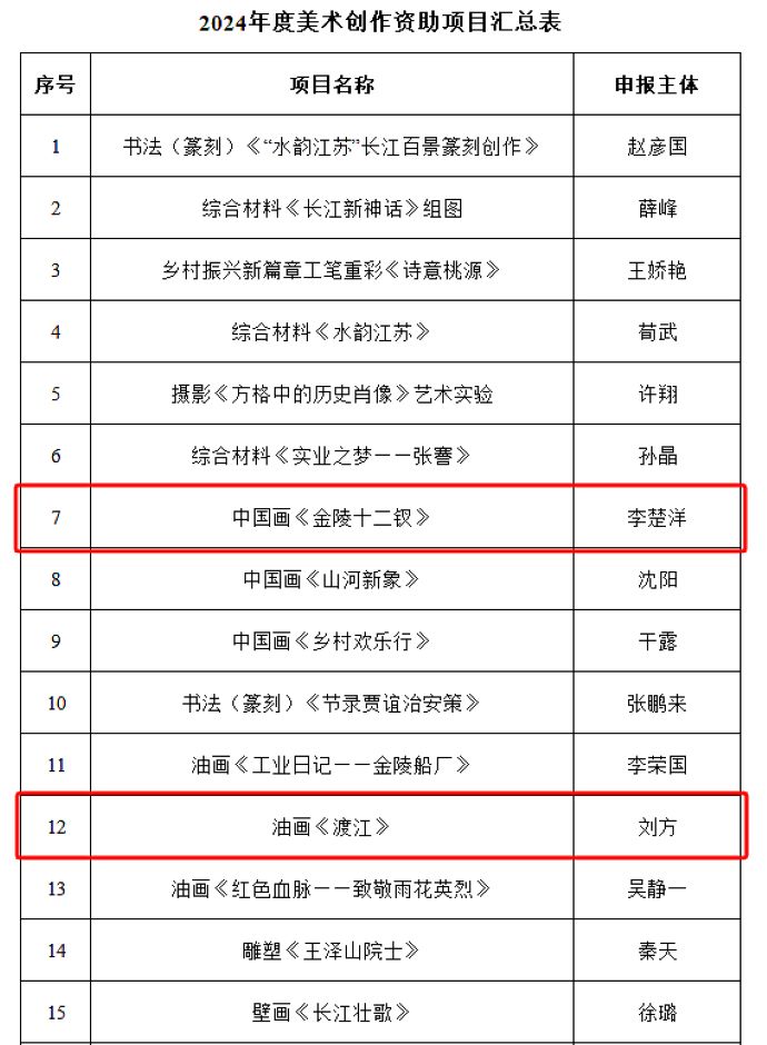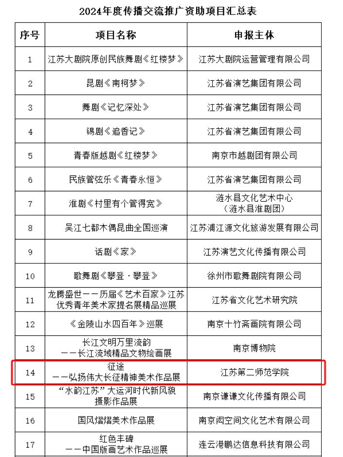 本次申报,学校高度重视,积极争取各方支持,组建专家团队反复研讨、打磨材料。经过多轮专家评审、答辩,最终在全省高校、文化单位、专业艺术院团中脱颖而出,其中美术学院“征途——弘扬伟大长征精神美术作品展”和中国画《金陵十二钗》分别获批传播交流推广资助项目和美术创作资助项目、传媒学院油画《渡江》获批美术创作资助项目。