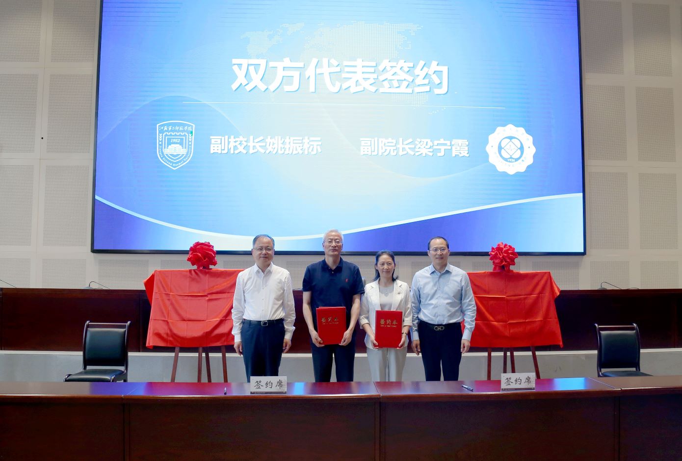 副校长姚振标、省人医副院长梁宁霞代表双方签署了战略合作协议。双方职能部门负责人共同为“学生实习实训基地”“创新型一站式学生社区”揭牌。