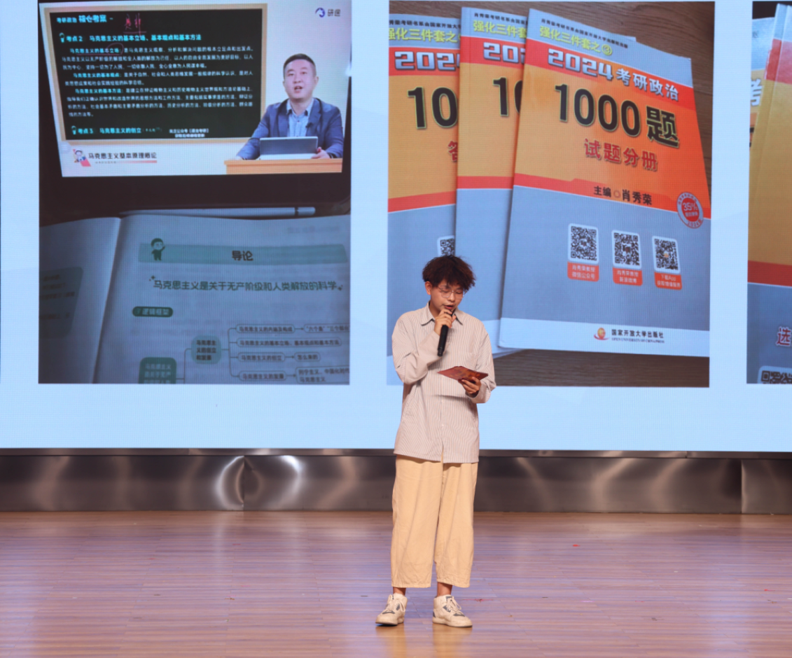 求真书院李雨龙、外国语学院董敏、人文学部蔡桢希、传媒学院袁盼盼、马克思主义学院李紫彦、外国语学院杨伦宇、生命科学与化学化工学院王雪婷7名同学依次上台,分享了备战考研的奋斗故事和心路历程。