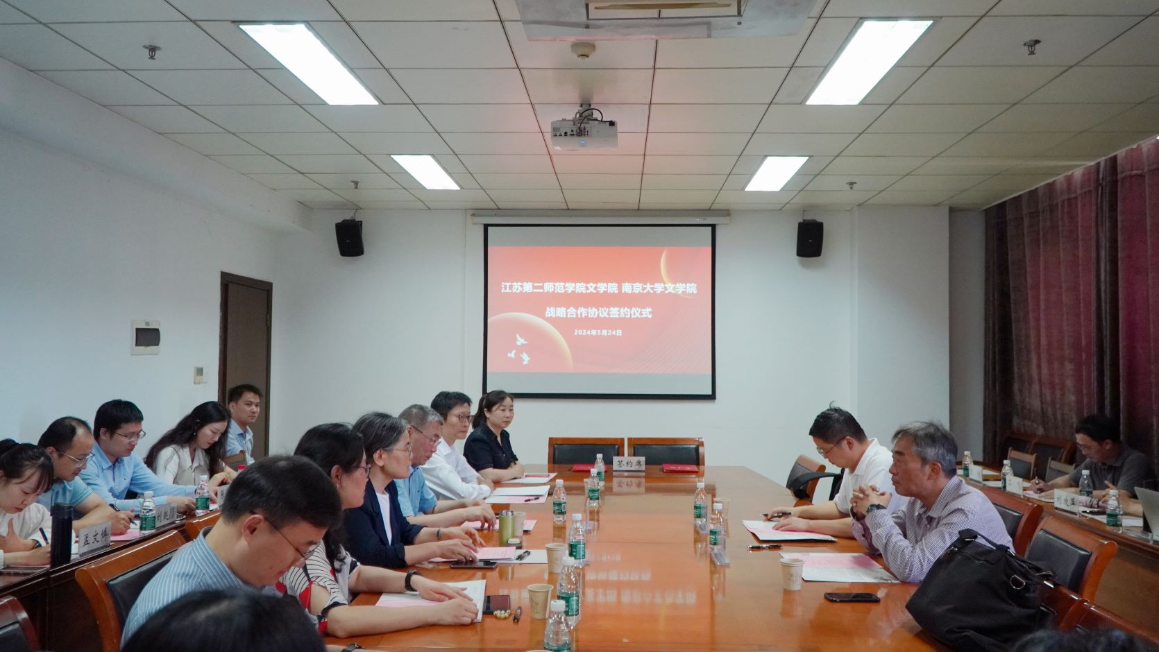 随后,赵敬鹏和董晓分别代表江苏第二师范学院文学院、南京大学文学院签署合作协议,正式开启了双方合作的新篇章。在签约仪式结束后,双方围绕“教育家思想与青年教师成长”和“一流大学的本科生培养”主题,展开深入的分组研讨。